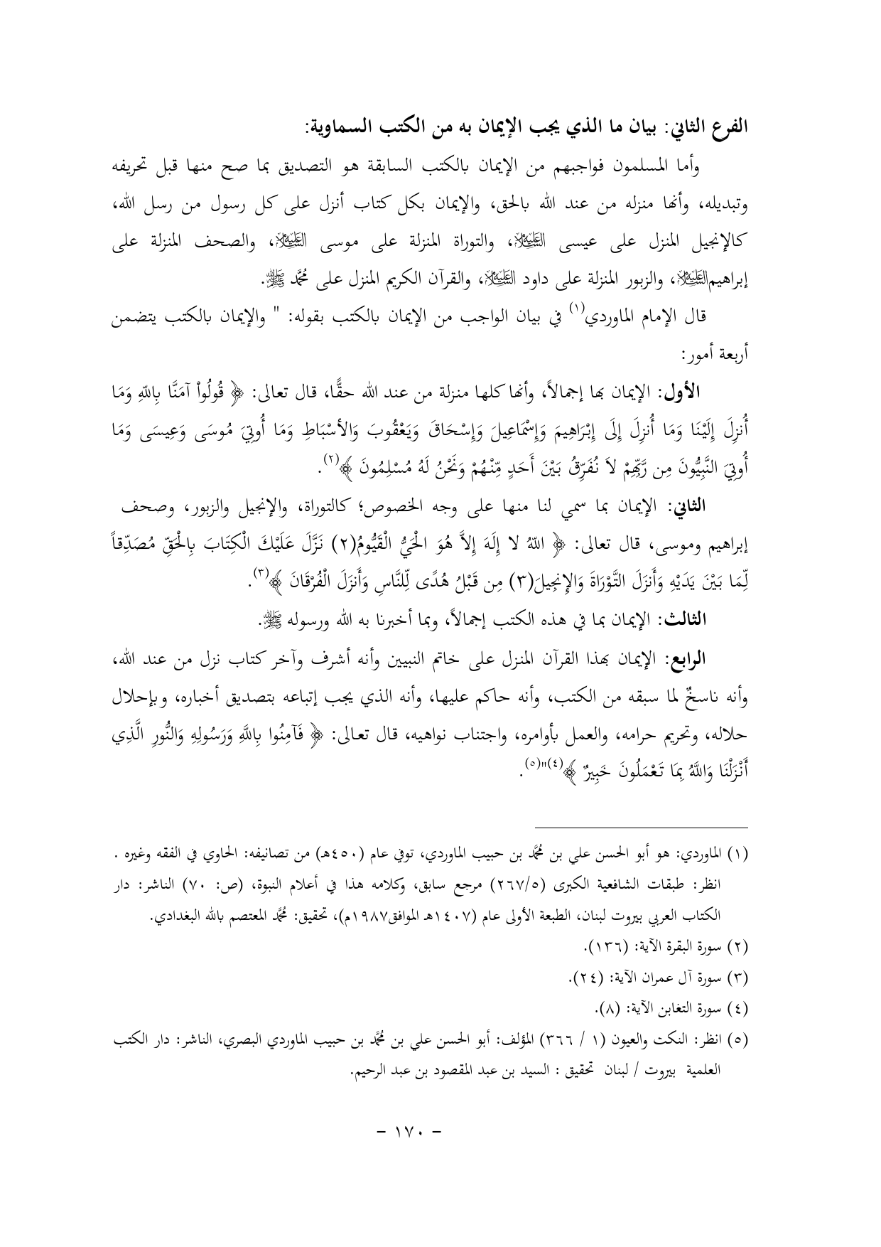قال الإمام الماوردي (¬1) في بيان الواجب من الإيمان بالكتب بقوله: " والإيمان بالكتب يتضمن أربعة أمور: