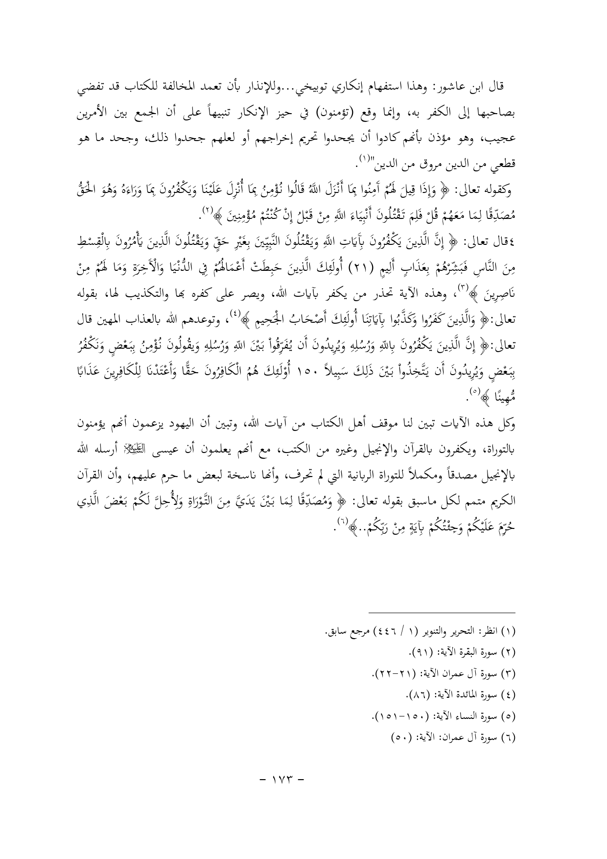 وكل هذه الآيات تبين لنا موقف أهل الكتاب من آيات الله, وتبين أن اليهود يزعمون أنهم يؤمنون بالتوراة, ويكفرون بالقرآن والإنجيل وغيره من الكتب, مع أنهم يعلمون أن عيسى - عليه السلام - أرسله الله بالإنجيل مصدقاً ومكملاً للتوراة الربانية التي لم تحرف, وأنها ناسخة لبعض ما حرم عليهم, وأن القرآن الكريم متمم لكل ماسبق بقوله تعالى: {وَمُصَدِّقًا لِمَا بَيْنَ يَدَيَّ مِنَ التَّوْرَاةِ وَلِأُحِلَّ لَكُمْ بَعْضَ الَّذِي حُرِّمَ عَلَيْكُمْ وَجِئْتُكُمْ بِآيَةٍ مِنْ رَبِّكُمْ .. } (¬6).