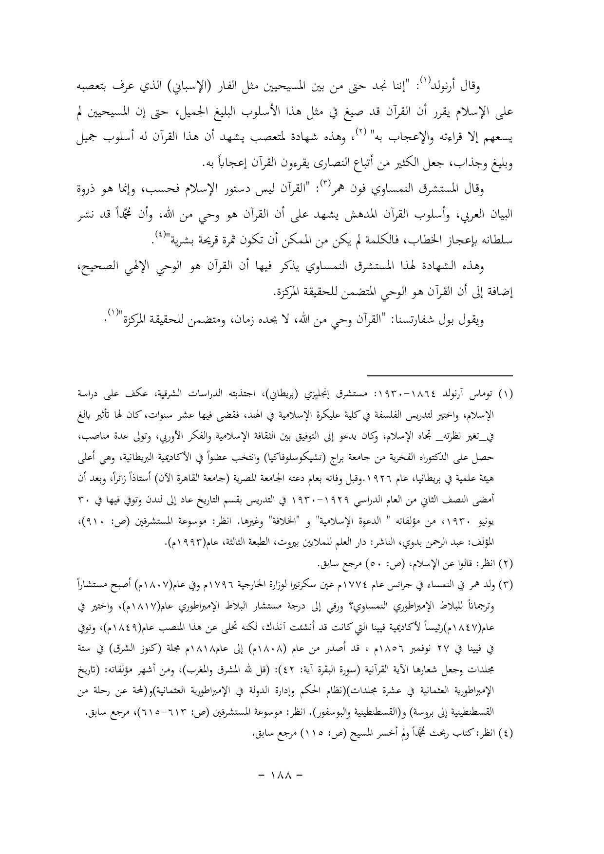 وقال أرنولد (¬1): "إننا نجد حتى من بين المسيحيين مثل الفار (الإسباني) الذي عرف بتعصبه على الإسلام يقرر أن القرآن قد صيغ في مثل هذا الأسلوب البليغ الجميل، حتى إن المسيحيين لم يسعهم إلا قراءته والإعجاب به" (¬2) , وهذه شهادة لمتعصب يشهد أن هذا القرآن له أسلوب جميل وبليغ وجذاب, جعل الكثير من أتباع النصارى يقرءون القرآن إعجاباً به.