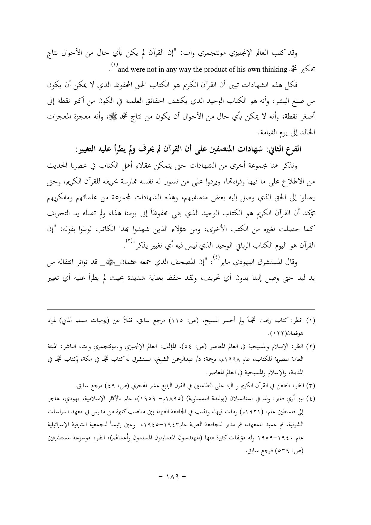 الفرع الثاني: شهادات المنصفين على أن القرآن لم يحرف ولم يطرأ عليه التغيير: