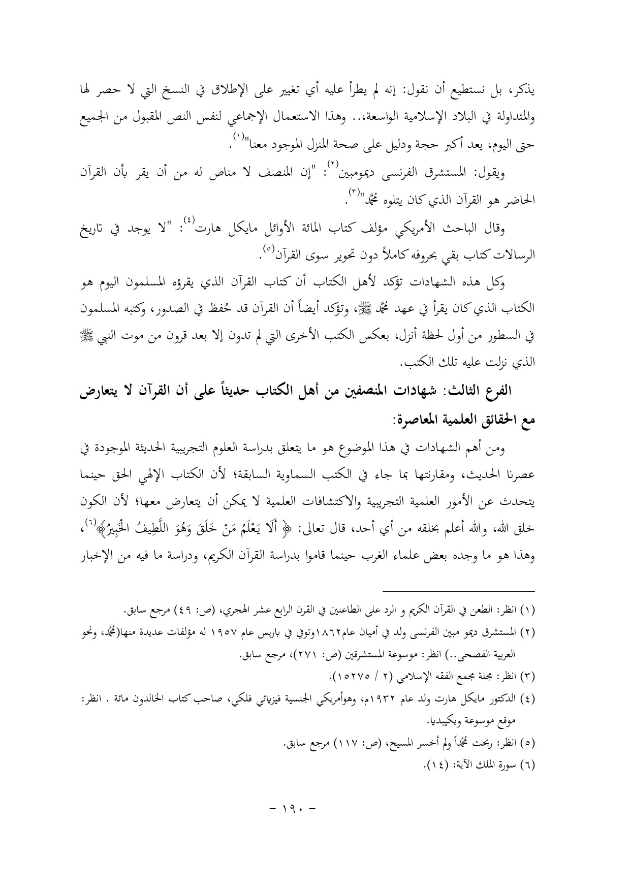الفرع الثالث: شهادات المنصفين من أهل الكتاب حديثاً على أن القرآن لا يتعارض مع الحقائق العلمية المعاصرة: