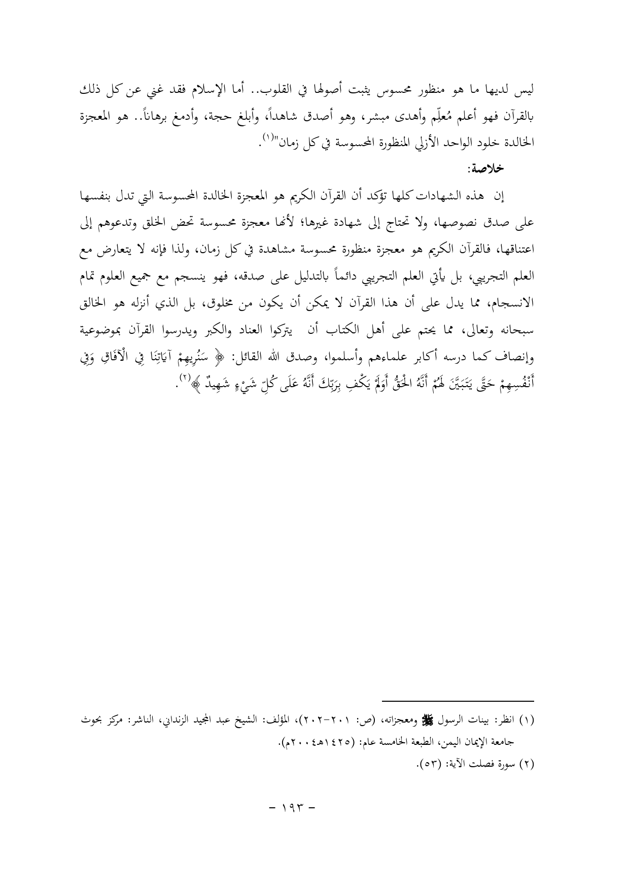 إن هذه الشهادات كلها تؤكد أن القرآن الكريم هو المعجزة الخالدة المحسوسة التي تدل بنفسها على صدق نصوصها, ولا تحتاج إلى شهادة غيرها؛ لأنها معجزة محسوسة تحض الخلق وتدعوهم إلى اعتناقها، فالقرآن الكريم هو معجزة منظورة محسوسة مشاهدة في كل زمان, ولذا فإنه لا يتعارض مع العلم التجريبي, بل يأتي العلم التجريبي دائماً بالتدليل على صدقه, فهو ينسجم مع جميع العلوم تمام الانسجام, مما يدل على أن هذا القرآن لا يمكن أن يكون من مخلوق, بل الذي أنزله هو الخالق سبحانه وتعالى, مما يحتم على أهل الكتاب أن يتركوا العناد والكبر ويدرسوا القرآن بموضوعية وإنصاف كما درسه أكابر علماءهم وأسلموا, وصدق الله القائل: {سَنُرِيهِمْ آيَاتِنَا فِي الْآفَاقِ وَفِي أَنْفُسِهِمْ حَتَّى يَتَبَيَّنَ لَهُمْ أَنَّهُ الْحَقُّ أَوَلَمْ يَكْفِ بِرَبِّكَ أَنَّهُ عَلَى كُلِّ شَيْءٍ شَهِيدٌ} (¬2).