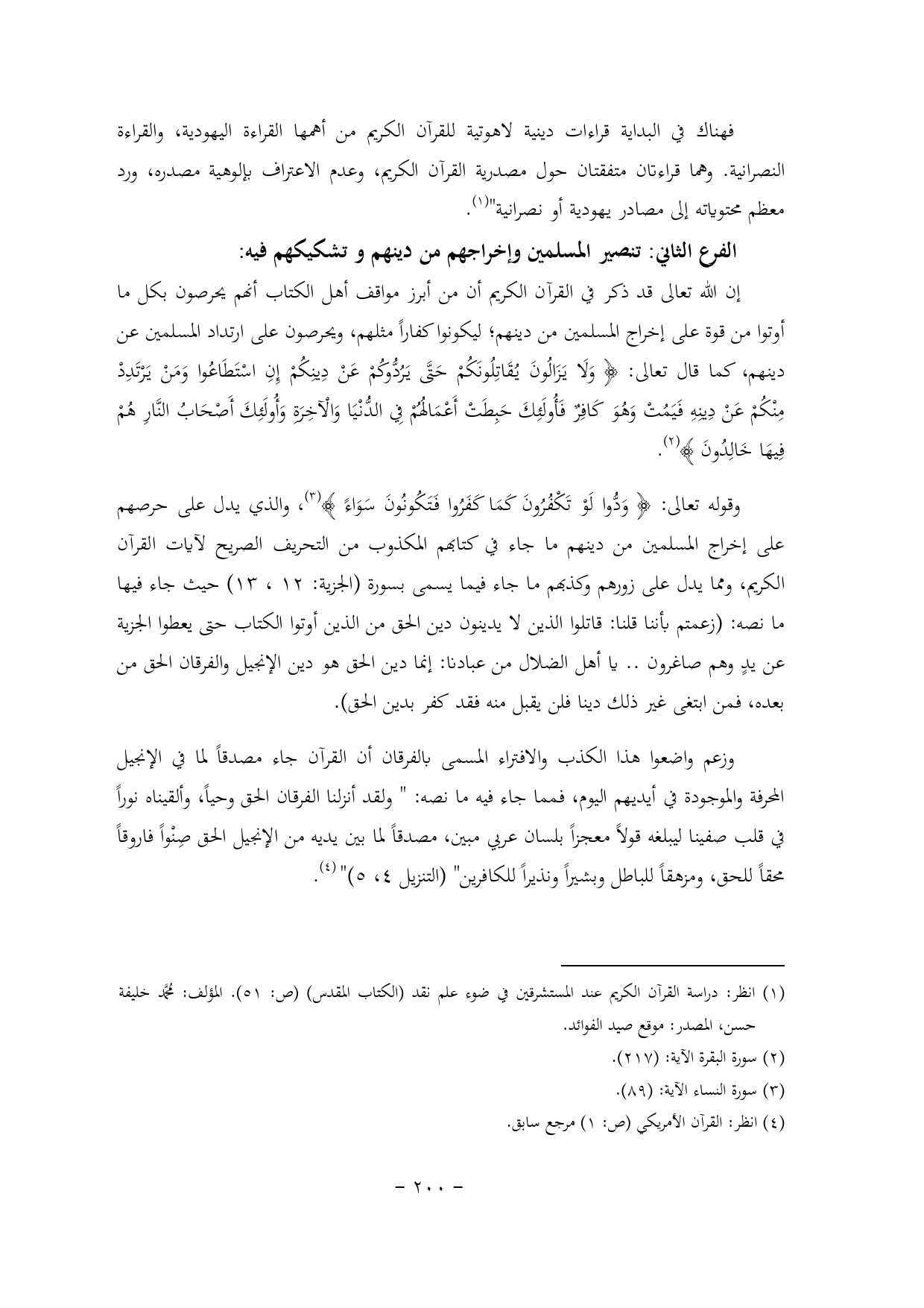 وقوله تعالى: {وَدُّوا لَوْ تَكْفُرُونَ كَمَا كَفَرُوا فَتَكُونُونَ سَوَاءً} (¬3) , والذي يدل على حرصهم على إخراج المسلمين من دينهم ما جاء في كتابهم المكذوب من التحريف الصريح لآيات القرآن الكريم, ومما يدل على زورهم وكذبهم ما جاء فيما يسمى بسورة (الجزية: 12، 13) حيث جاء فيها ما نصه: (زعمتم بأننا قلنا: قاتلوا الذين لا يدينون دين الحق من الذين أوتوا الكتاب حتى يعطوا الجزية عن يدٍ وهم صاغرون .. يا أهل الضلال من عبادنا: إنما دين الحق هو دين الإنجيل والفرقان الحق من بعده, فمن ابتغى غير ذلك دينا فلن يقبل منه فقد كفر بدين الحق).