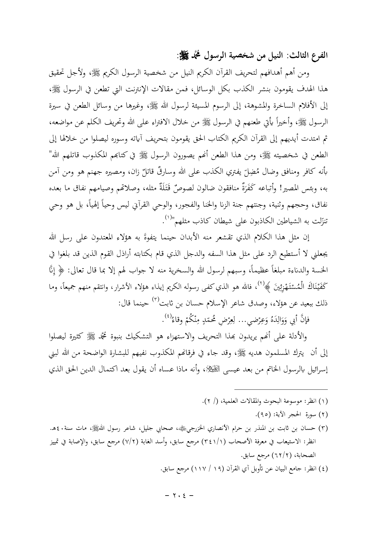 الفرع الثالث: النيل من شخصية الرسول محمد - صلى الله عليه وسلم -: