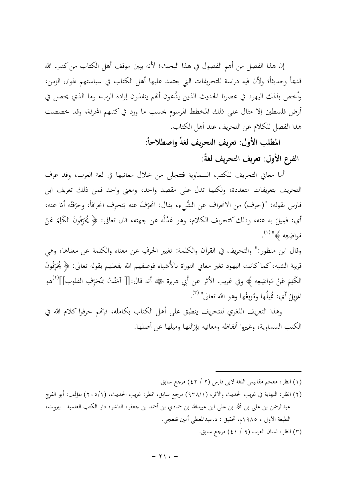 إن هذا الفصل من أهم الفصول في هذا البحث؛ لأنه يبين موقف أهل الكتاب من كتب الله قديماً وحديثاً؛ ولأن فيه دراسة للتحريفات التي يعتمد عليها أهل الكتاب في سياستهم طوال الزمن, وأخص بذلك اليهود في عصرنا الحديث الذين يدَّعون أنهم ينفذون إرادة الرب, وما الذي يحصل في أرض فلسطين إلا مثال على ذلك المخطط المرسوم بحسب ما ورد في كتبهم المحرفة, وقد خصصت هذا الفصل للكلام عن التحريف عند أهل الكتاب.