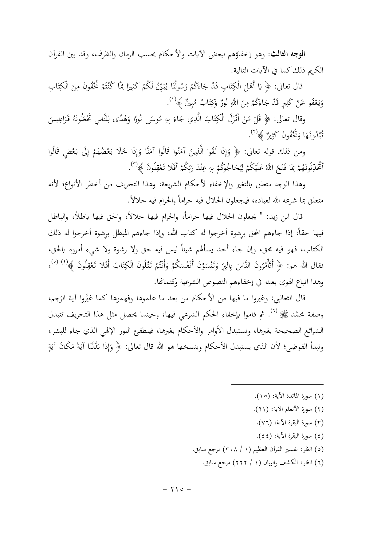 الوجه الثالث: وهو إخفاؤهم لبعض الآيات والأحكام بحسب الزمان والظرف, وقد بين القرآن الكريم ذلك كما في الآيات التالية.