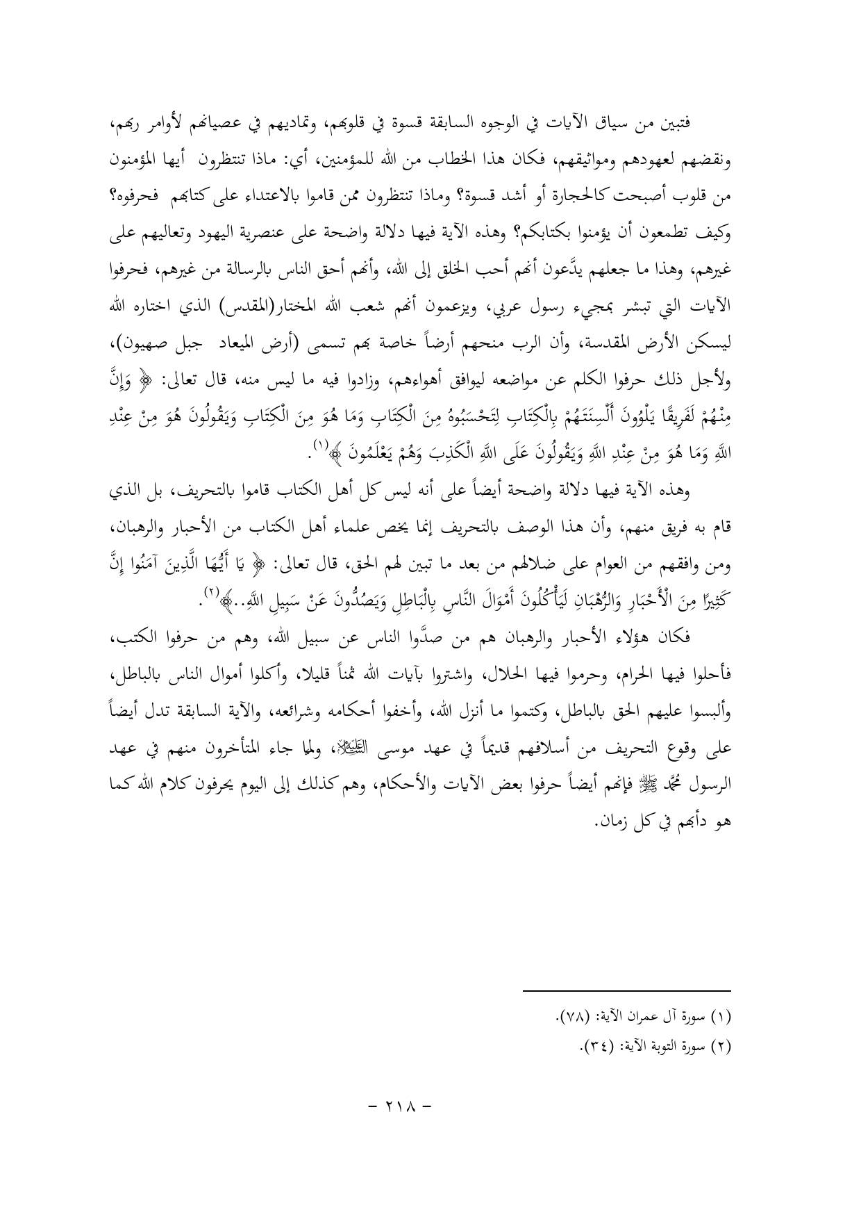 وهذه الآية فيها دلالة واضحة أيضاً على أنه ليس كل أهل الكتاب قاموا بالتحريف, بل الذي قام به فريق منهم, وأن هذا الوصف بالتحريف إنما يخص علماء أهل الكتاب من الأحبار والرهبان, ومن وافقهم من العوام على ضلالهم من بعد ما تبين لهم الحق, قال تعالى: {يَا أَيُّهَا الَّذِينَ آمَنُوا إِنَّ كَثِيرًا مِنَ الْأَحْبَارِ وَالرُّهْبَانِ لَيَأْكُلُونَ أَمْوَالَ النَّاسِ بِالْبَاطِلِ وَيَصُدُّونَ عَنْ سَبِيلِ اللَّهِ .. } (¬2).
