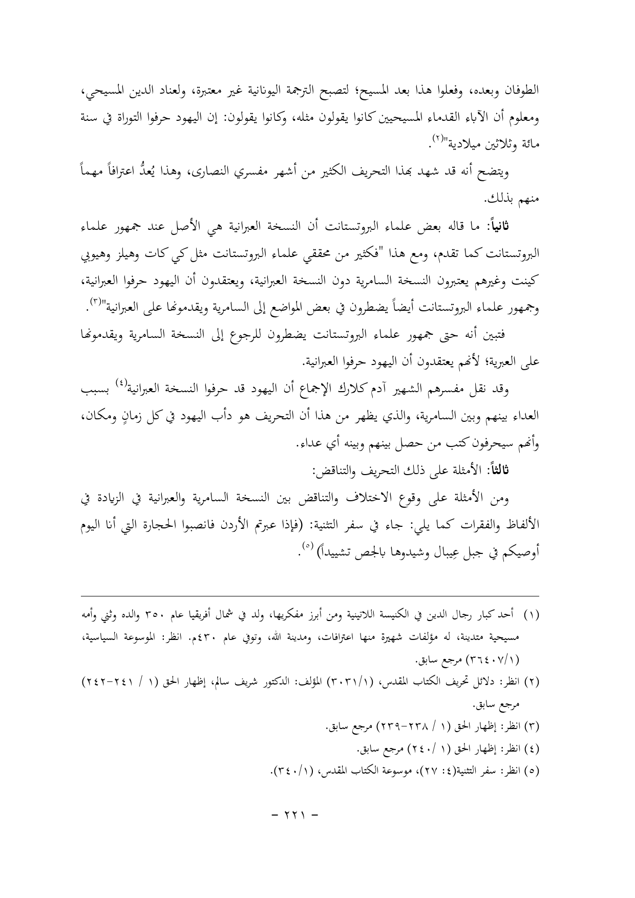 فتبين أنه حتى جمهور علماء البروتستانت يضطرون للرجوع إلى النسخة السامرية ويقدمونها على العبرية؛ لأنهم يعتقدون أن اليهود حرفوا العبرانية.