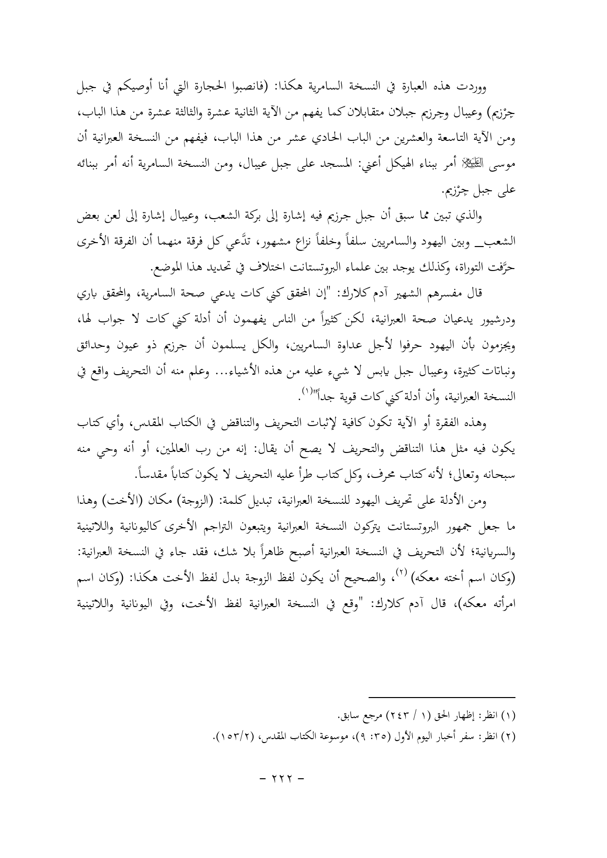قال مفسرهم الشهير آدم كلارك: "إن المحقق كني كات يدعي صحة السامرية, والمحقق باري ودرشيور يدعيان صحة العبرانية، لكن كثيراً من الناس يفهمون أن أدلة كني كات لا جواب لها، ويجزمون بأن اليهود حرفوا لأجل عداوة السامريين، والكل يسلمون أن جرزيم ذو عيون وحدائق ونباتات كثيرة، وعيبال جبل يابس لا شيء عليه من هذه الأشياء ... وعلم منه أن التحريف واقع في النسخة العبرانية, وأن أدلة كني كات قوية جداً" (¬1).