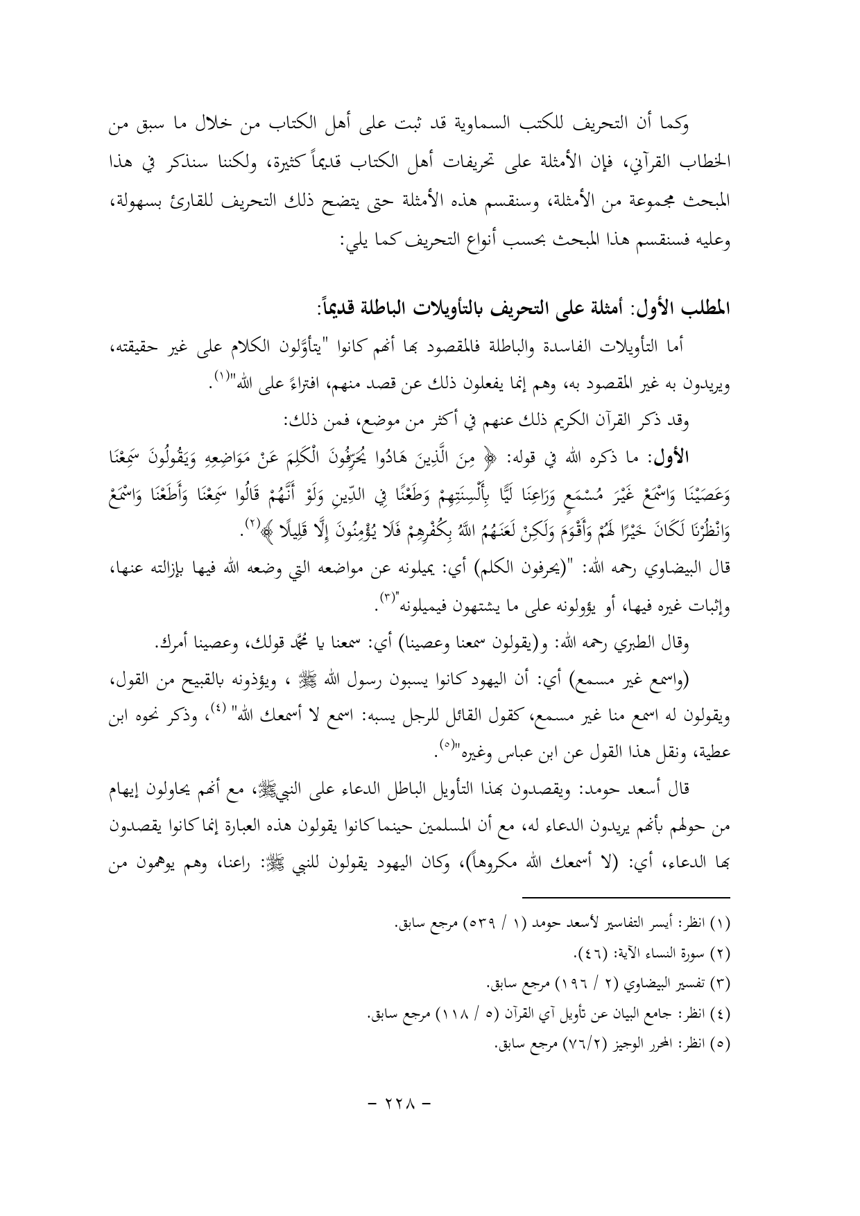الأول: ما ذكره الله في قوله: {مِنَ الَّذِينَ هَادُوا يُحَرِّفُونَ الْكَلِمَ عَنْ مَوَاضِعِهِ وَيَقُولُونَ سَمِعْنَا وَعَصَيْنَا وَاسْمَعْ غَيْرَ مُسْمَعٍ وَرَاعِنَا لَيًّا بِأَلْسِنَتِهِمْ وَطَعْنًا فِي الدِّينِ وَلَوْ أَنَّهُمْ قَالُوا سَمِعْنَا وَأَطَعْنَا وَاسْمَعْ وَانْظُرْنَا لَكَانَ خَيْرًا لَهُمْ وَأَقْوَمَ وَلَكِنْ لَعَنَهُمُ اللَّهُ بِكُفْرِهِمْ فَلَا يُؤْمِنُونَ إِلَّا قَلِيلًا} (¬2).