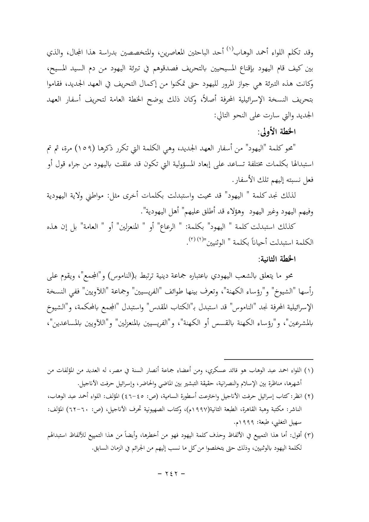 وقد تكلم اللواء أحمد الوهاب (¬1) أحد الباحثين المعاصرين, والمتخصصين بدراسة هذا المجال, والذي بين كيف قام اليهود بإقناع المسيحيين بالتحريف فصدقوهم في تبرئة اليهود من دم السيد المسيح, وكانت هذه التبرئة هي جواز المرور لليهود حتى تمكنوا من إكمال التحريف في العهد الجديد, فقاموا بتحريف النسخة الإسرائيلية المحرفة أصلاً, وكان ذلك يوضح الخطة العامة لتحريف أسفار العهد الجديد والتي سارت على النحو التالي: