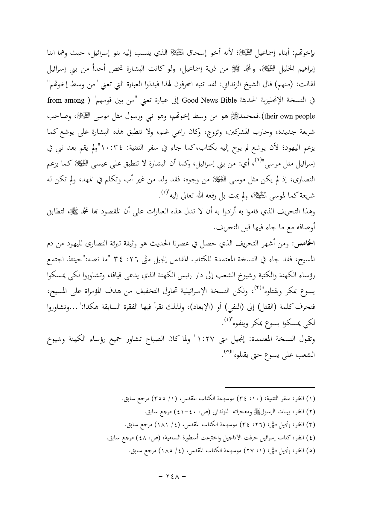 بإخوتهم: أبناء إسماعيل - عليه السلام -؛ لأنه أخو إسحاق - عليه السلام - الذي ينسب إليه بنو إسرائيل، حيث وهما ابنا إبراهيم الخليل - عليه السلام -، ومحمد - صلى الله عليه وسلم - من ذرية إسماعيل, ولو كانت البشارة تخص أحداً من بني إسرائيل لقالت: (منهم) قال الشيخ الزنداني: لقد تنبه المحرفون لهذا فبدلوا العبارة التي تعني "من وسط إخوتهم" في النسخة الإنجليزية الحديثة Good News Bible إلى عبارة تعني "من بين قومهم" (from among their own people). فمحمد - صلى الله عليه وسلم - هو من وسط إخوتهم، وهو نبي ورسول مثل موسى - عليه السلام - , وصاحب شريعة جديدة، وحارب المشركين, وتزوج, وكان راعي غنم، ولا تنطبق هذه البشارة على يوشع كما يزعم اليهود؛ لأن يوشع لم يوح إليه بكتاب، كما جاء في سفر التثنية: 10: 34"ولم يقم بعد نبي في إسرائيل مثل موسى" (¬1) , أي: من بني إسرائيل, وكما أن البشارة لا تنطبق على عيسى - عليه السلام - كما يزعم النصارى، إذ لم يكن مثل موسى - عليه السلام - من وجوه، فقد ولد من غير أب وتكلم في المهد, ولم تكن له شريعة كما لموسى - عليه السلام -، ولم يمت بل رفعه الله تعالى إليه" (¬2).