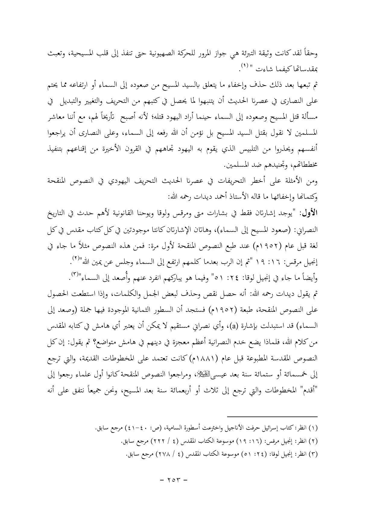 الأول: "يوجد إشارتان فقط في بشارات متى ومرقس ولوقا ويوحنا القانونية لأهم حدث في التاريخ النصراني: (صعود المسيح إلى السماء) , وهاتان الإشارتان كانتا موجودتين في كل كتاب مقدس في كل لغة قبل عام (1952 م) عند طبع النصوص المنقحة لأول مرة: فمن هذه النصوص مثلاً ما جاء في إنجيل مرقس: 16: 19 "ثم إن الرب بعدما كلمهم ارتفع إلى السماء وجلس عن يمين الله" (¬2).