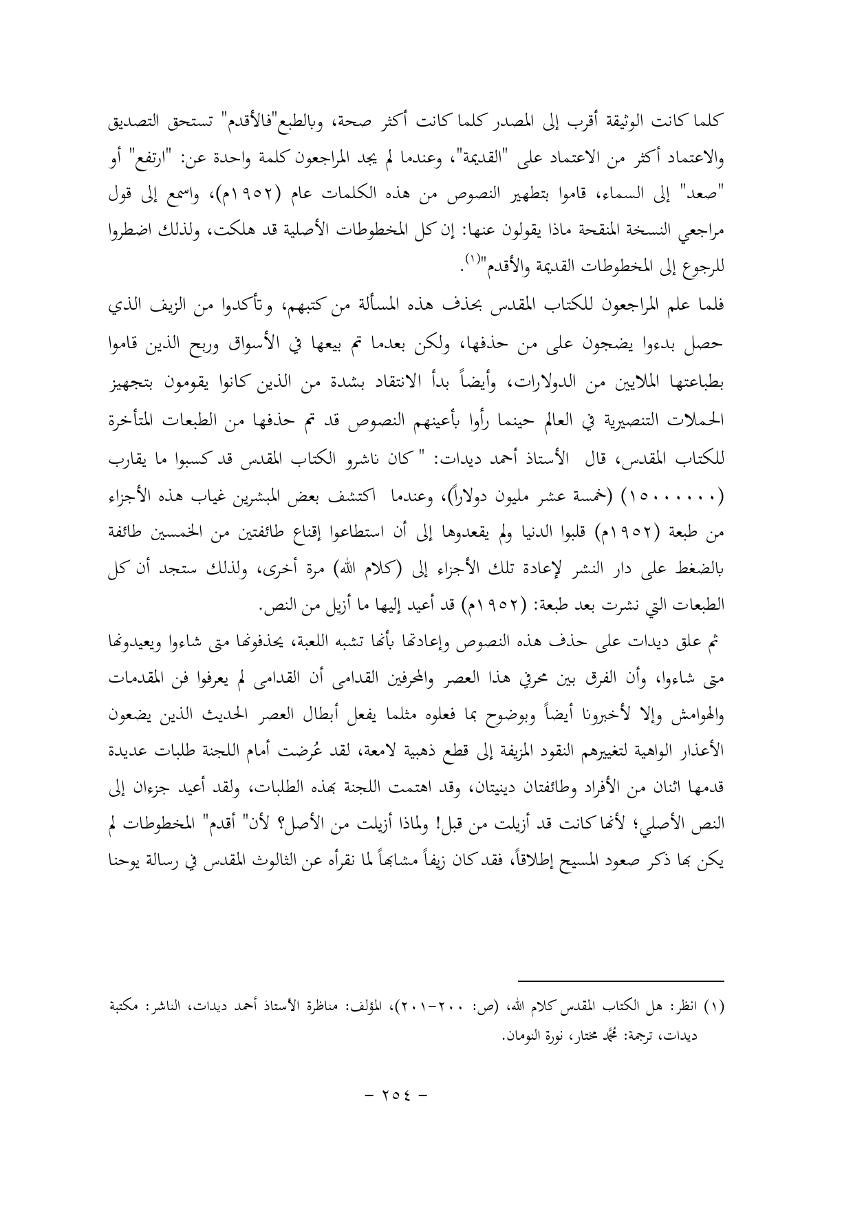 ثم علق ديدات على حذف هذه النصوص وإعادتها بأنها تشبه اللعبة, يحذفونها متى شاءوا ويعيدونها متى شاءوا, وأن الفرق بين محرفي هذا العصر والمحرفين القدامى أن القدامى لم يعرفوا فن المقدمات والهوامش وإلا لأخبرونا أيضاً وبوضوح بما فعلوه مثلما يفعل أبطال العصر الحديث الذين يضعون الأعذار الواهية لتغييرهم النقود المزيفة إلى قطع ذهبية لامعة, لقد عُرضت أمام اللجنة طلبات عديدة قدمها اثنان من الأفراد وطائفتان دينيتان, وقد اهتمت اللجنة بهذه الطلبات, ولقد أعيد جزءان إلى النص الأصلي؛ لأنها كانت قد أزيلت من قبل! ولماذا أزيلت من الأصل؟ لأن" أقدم" المخطوطات لم يكن بها ذكر صعود المسيح إطلاقاً، فقد كان زيفاً مشابهاً لما نقرأه عن الثالوث المقدس في رسالة يوحنا