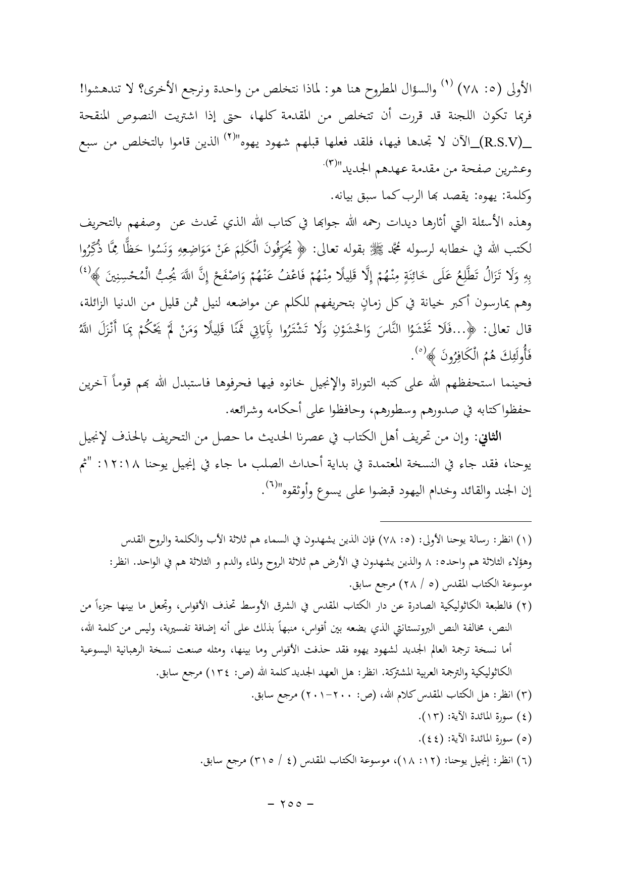 الأولى (5: 78) (¬1) والسؤال المطروح هنا هو: لماذا نتخلص من واحدة ونرجع الأخرى؟ لا تندهشوا! فربما تكون اللجنة قد قررت أن تتخلص من المقدمة كلها, حتى إذا اشتريت النصوص المنقحة _ (R.S.V)_ الآن لا تجدها فيها, فلقد فعلها قبلهم شهود يهوه" (¬2)