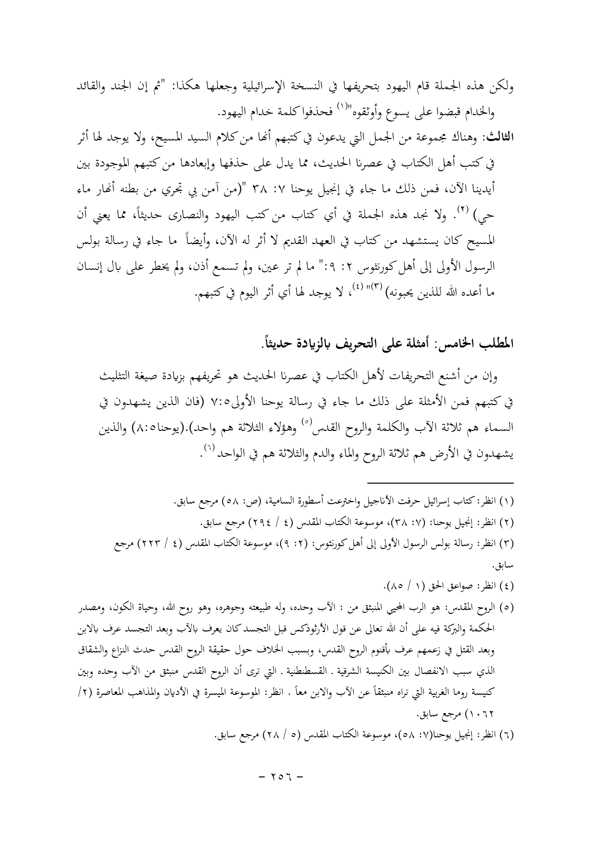 وإن من أشنع التحريفات لأهل الكتاب في عصرنا الحديث هو تحريفهم بزيادة صيغة التثليث في كتبهم فمن الأمثلة على ذلك ما جاء في رسالة يوحنا الأولى 7: 5 (فان الذين يشهدون في السماء هم ثلاثة الآب والكلمة والروح القدس (¬5) وهؤلاء الثلاثة هم واحد). (يوحنا 8: 5) والذين يشهدون في الأرض هم ثلاثة الروح والماء والدم والثلاثة هم في الواحد (¬6).
