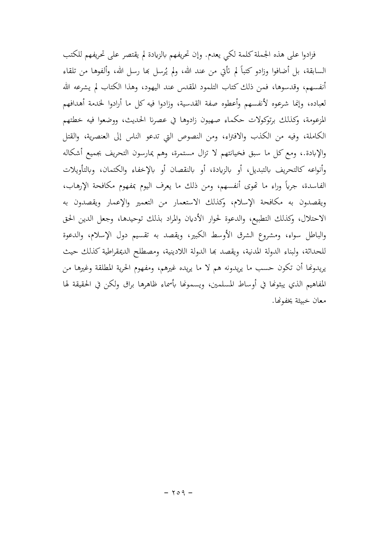 فزادوا على هذه الجملة كلمة لكي يعدم. وإن تحريفهم بالزيادة لم يقتصر على تحريفهم للكتب السابقة, بل أضافوا وزادو كتباً لم تأتي من عند الله, ولم يُرسل بها رسل الله, وألفوها من تلقاء أنفسهم, وقدسوها, فمن ذلك كتاب التلمود المقدس عند اليهود, وهذا الكتاب لم يشرعه الله لعباده, وإنما شرعوه لأنفسهم وأعطوه صفة القدسية, وزادوا فيه كل ما أرادوا لخدمة أهدافهم المزعومة, وكذلك برتوكولات حكماء صهيون زادوها في عصرنا الحديث, ووضعوا فيه خطتهم الكاملة, وفيه من الكذب والافتراء, ومن النصوص التي تدعو الناس إلى العنصرية, والقتل والإبادة., ومع كل ما سبق فخيانتهم لا تزال مستمرة, وهم يمارسون التحريف بجميع أشكاله وأنواعه كالتحريف بالتبديل, أو بالزيادة, أو بالنقصان أو بالإخفاء والكتمان, وبالتأويلات الفاسدة, جرياً وراء ما تهوى أنفسهم, ومن ذلك ما يعرف اليوم بمفهوم مكافحة الإرهاب, ويقصدون به مكافحة الإسلام, وكذلك الاستعمار من التعمير والإعمار ويقصدون به الاحتلال, وكذلك التطبيع, والدعوة لحوار الأديان والمراد بذلك توحيدها, وجعل الدين الحق والباطل سواء, ومشروع الشرق الأوسط الكبير, ويقصد به تقسيم دول الإسلام, والدعوة للحداثة, ولبناء الدولة المدنية, ويقصد بها الدولة اللادينية, ومصطلح الديمقراطية كذلك حيث يريدونها أن تكون حسب ما يريدونه هم لا ما يريده غيرهم, ومفهوم الحرية المطلقة وغيرها من المفاهيم الذي يبثونها في أوساط المسلمين, ويسمونها بأسماء ظاهرها براق ولكن في الحقيقة لها معان خبيثة يخفونها.