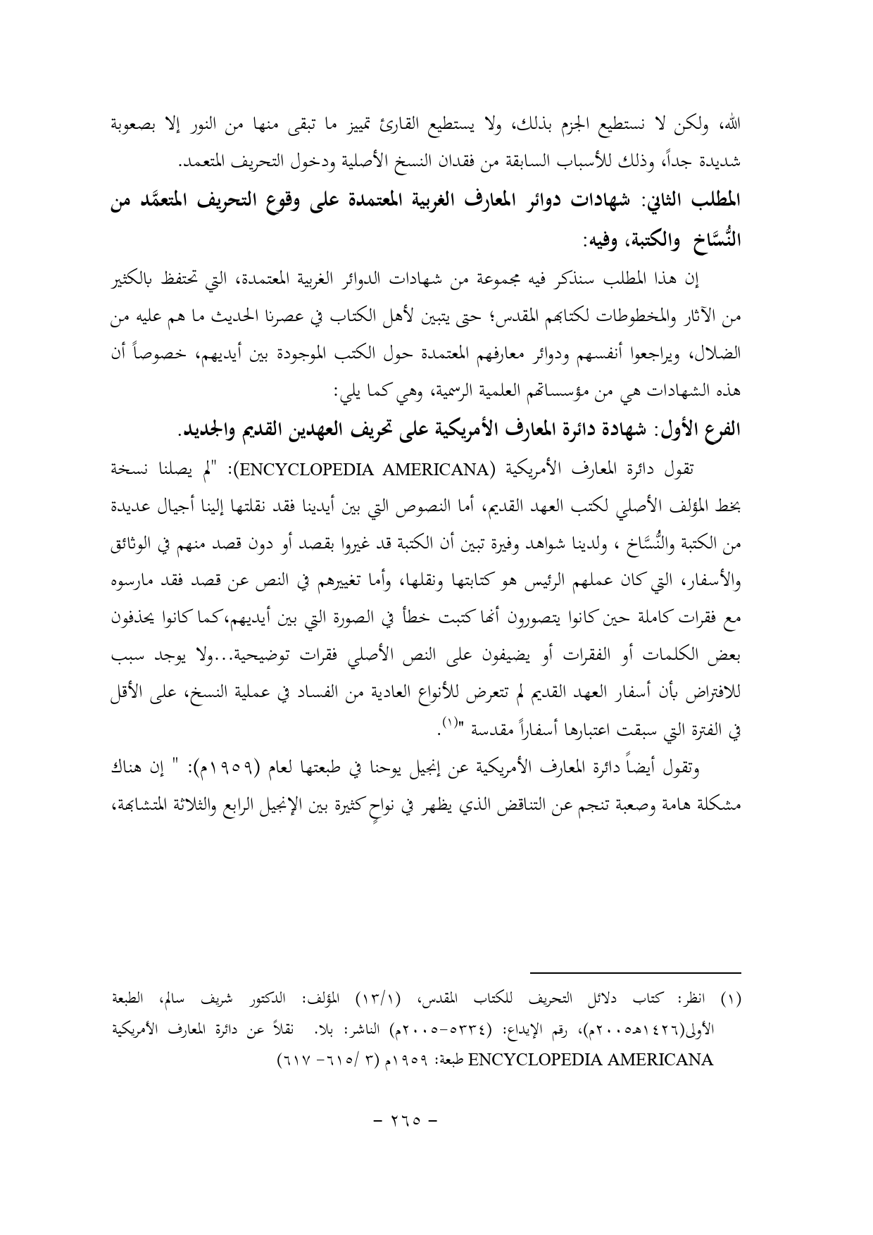 المطلب الثاني: شهادات دوائر المعارف الغربية المعتمدة على وقوع التحريف المتعمَّد من النُّسَّاخ والكتبة, وفيه: