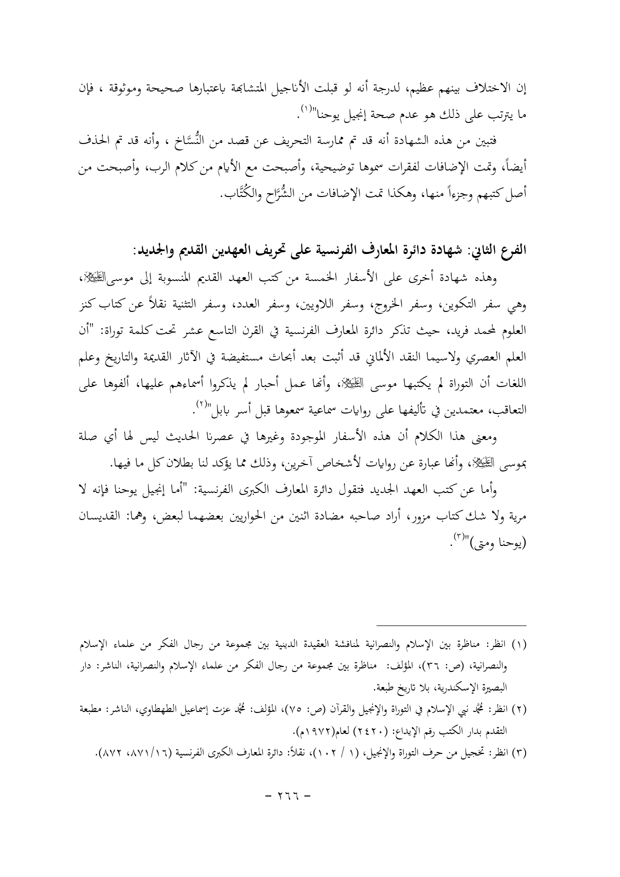 الفرع الثاني: شهادة دائرة المعارف الفرنسية على تحريف العهدين القديم والجديد: