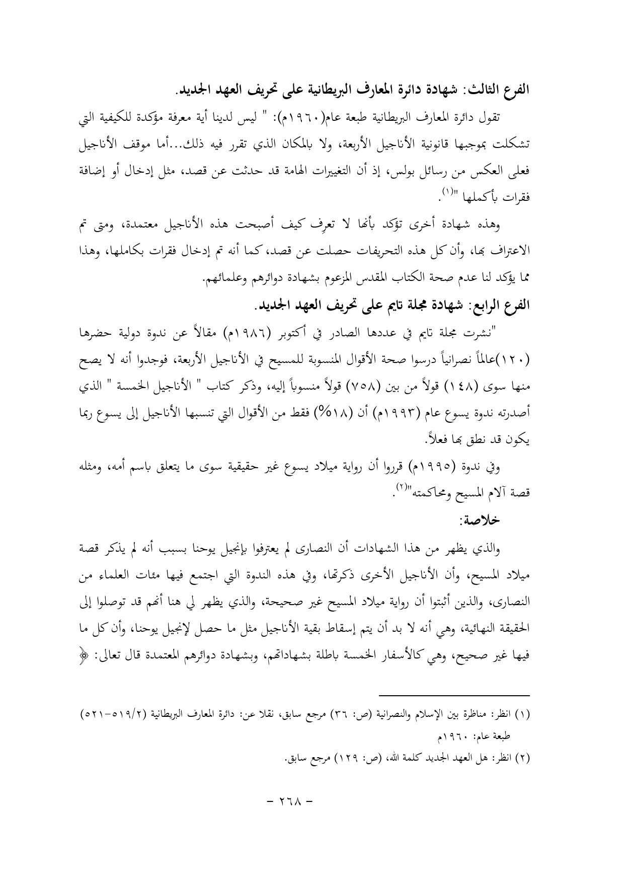(¬1) انظر: مناظرة بين الإسلام والنصرانية (ص: 36) مرجع سابق, نقلا عن: دائرة المعارف البريطانية (2/ 519 - 521) طبعة عام: 1960 م