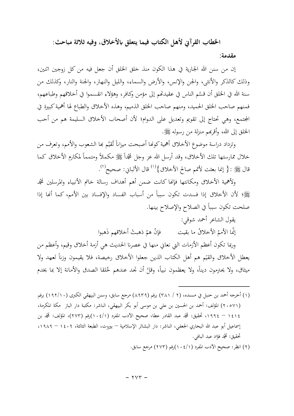 الخطاب القرآني لأهل الكتاب فيما يتعلق بالأخلاق, وفيه ثلاثة مباحث: