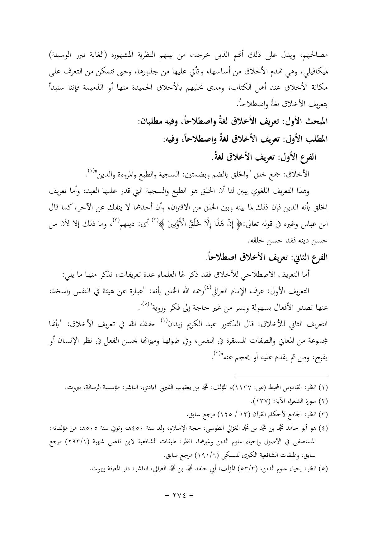 مصالحهم, ويدل على ذلك أنهم الذين خرجت من بينهم النظرية المشهورة (الغاية تبرر الوسيلة) لميكافيلي, وهي تهدم الأخلاق من أساسها, وتأتي عليها من جذورها, وحتى نتمكن من التعرف على مكانة الأخلاق عند أهل الكتاب, ومدى تحليهم بالأخلاق الحميدة منها أو الذميمة فإننا سنبدأ بتعريف الأخلاق لغةً واصطلاحاً.