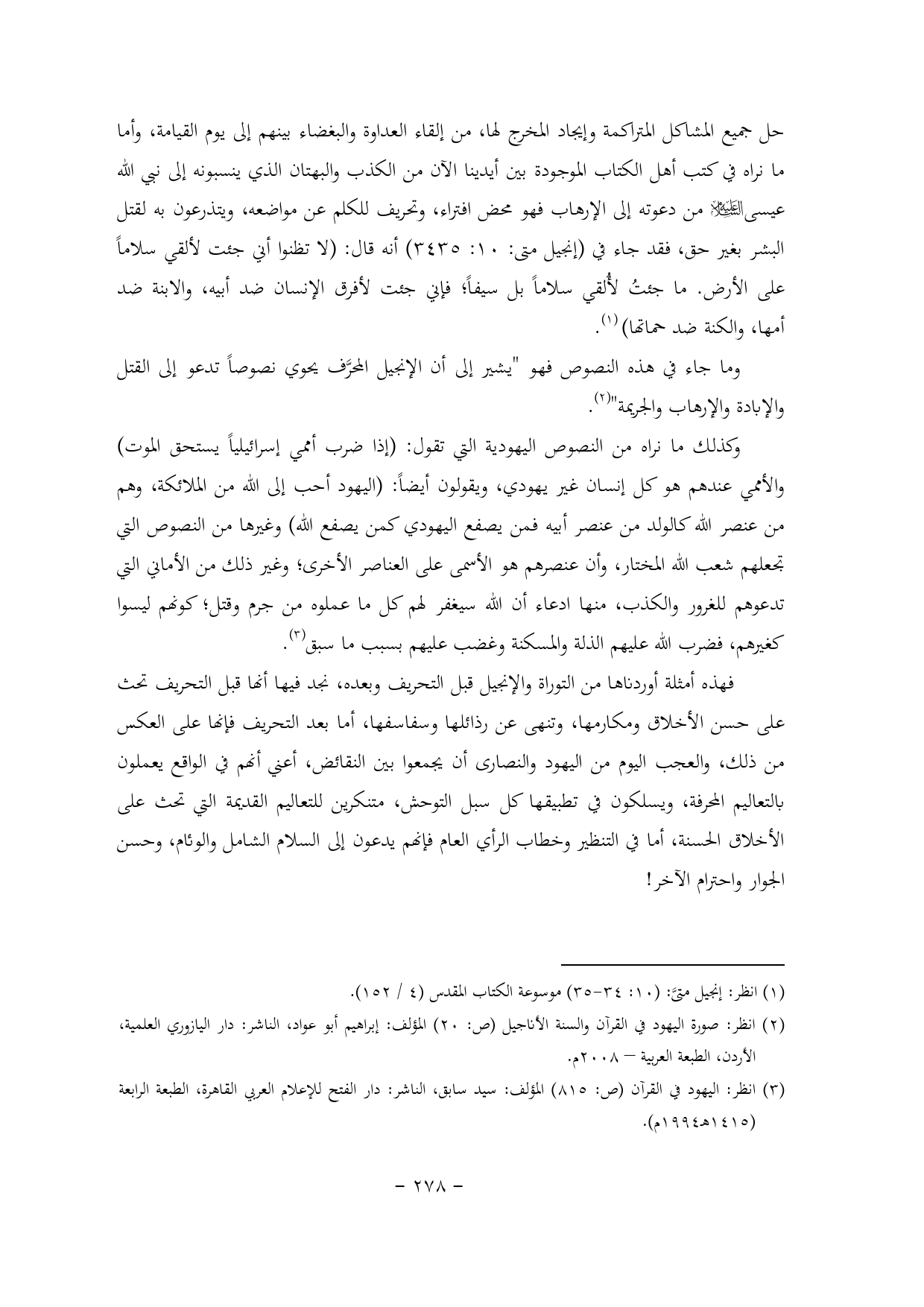 حل جميع المشاكل المتراكمة وإيجاد المخرج لها, من إلقاء العداوة والبغضاء بينهم إلى يوم القيامة, وأما ما نراه في كتب أهل الكتاب الموجودة بين أيدينا الآن من الكذب والبهتان الذي ينسبونه إلى نبي الله عيسى - عليه السلام - من دعوته إلى الإرهاب فهو محض افتراء, وتحريف للكلم عن مواضعه, ويتذرعون به لقتل البشر بغير حق, فقد جاء في (إنجيل متى: 10: 3435) أنه قال: (لا تظنوا أني جئت لألقي سلاماً على الأرض. ما جئتُ لأُلقي سلاماً بل سيفاً؛ فإني جئت لأفرق الإنسان ضد أبيه, والابنة ضد أمها, والكنة ضد حماتها) (¬1).