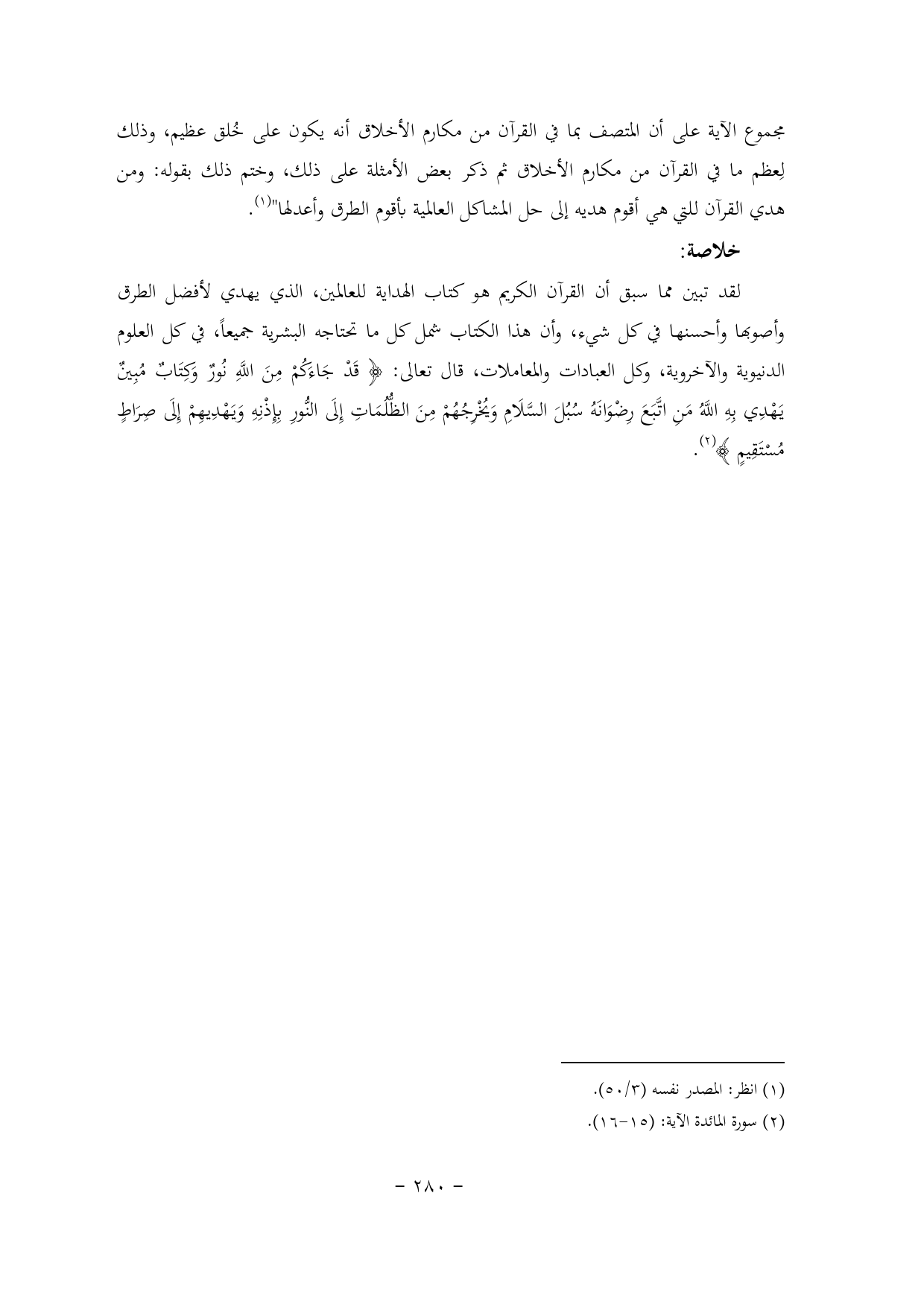 لقد تبين مما سبق أن القرآن الكريم هو كتاب الهداية للعالمين, الذي يهدي لأفضل الطرق وأصوبها وأحسنها في كل شيء, وأن هذا الكتاب شمل كل ما تحتاجه البشرية جميعاً, في كل العلوم الدنيوية والآخروية, وكل العبادات والمعاملات, قال تعالى: {قَدْ جَاءَكُمْ مِنَ اللَّهِ نُورٌ وَكِتَابٌ مُبِينٌ يَهْدِي بِهِ اللَّهُ مَنِ اتَّبَعَ رِضْوَانَهُ سُبُلَ السَّلَامِ وَيُخْرِجُهُمْ مِنَ الظُّلُمَاتِ إِلَى النُّورِ بِإِذْنِهِ وَيَهْدِيهِمْ إِلَى صِرَاطٍ مُسْتَقِيمٍ} (¬2).