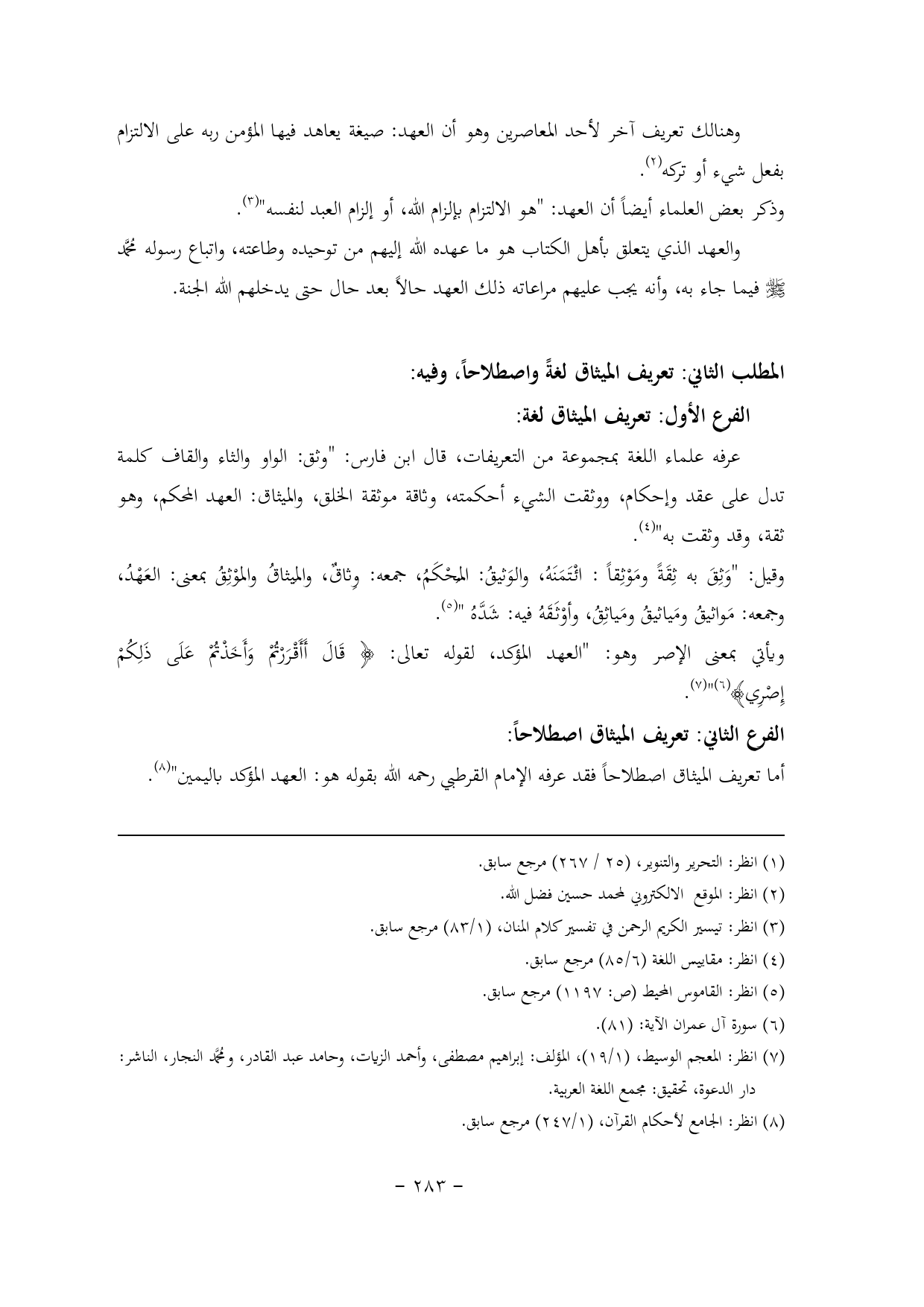 المطلب الثاني: تعريف الميثاق لغةً واصطلاحاً, وفيه: