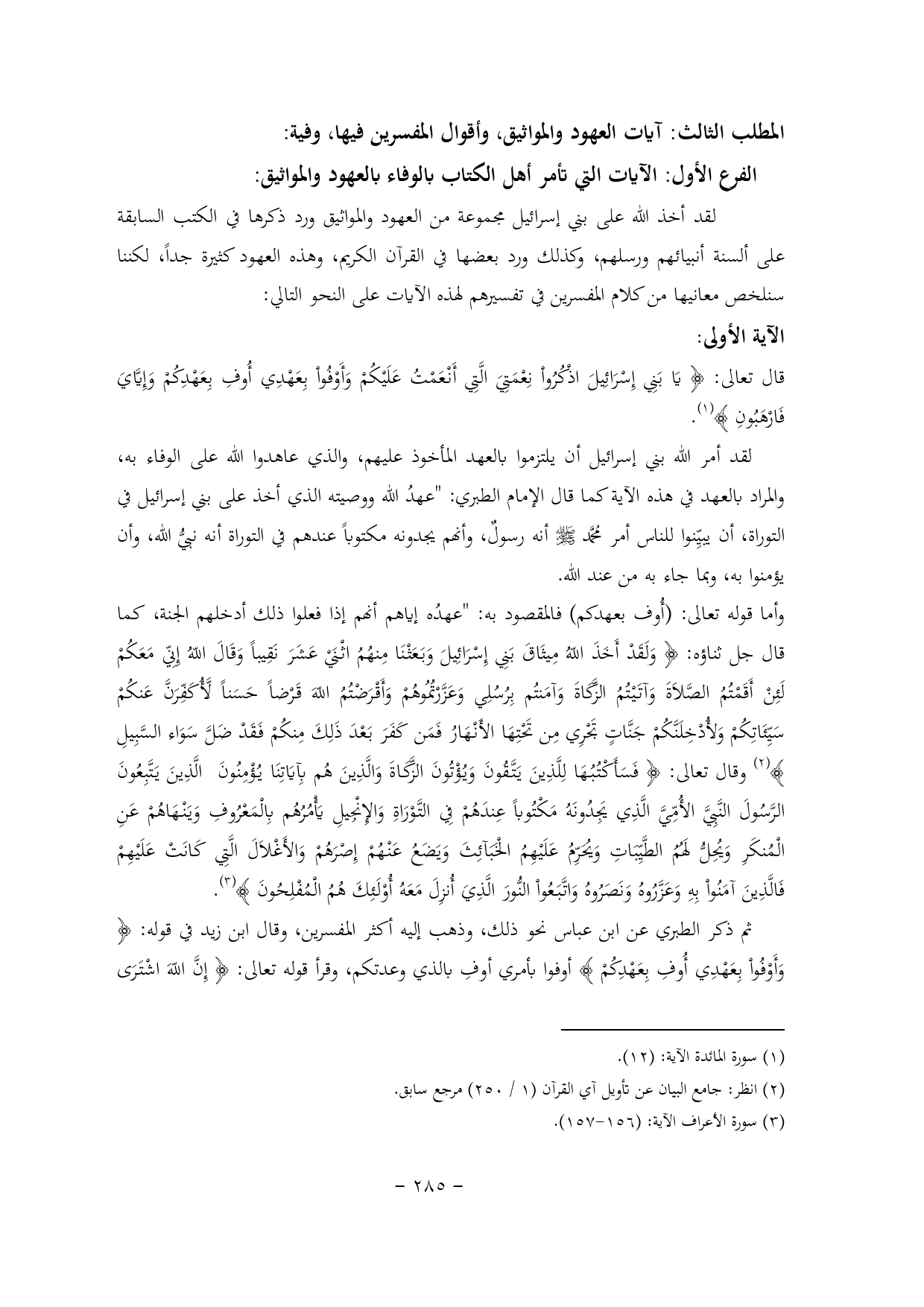 المطلب الثالث: آيات العهود والمواثيق, وأقوال المفسرين فيها, وفية: