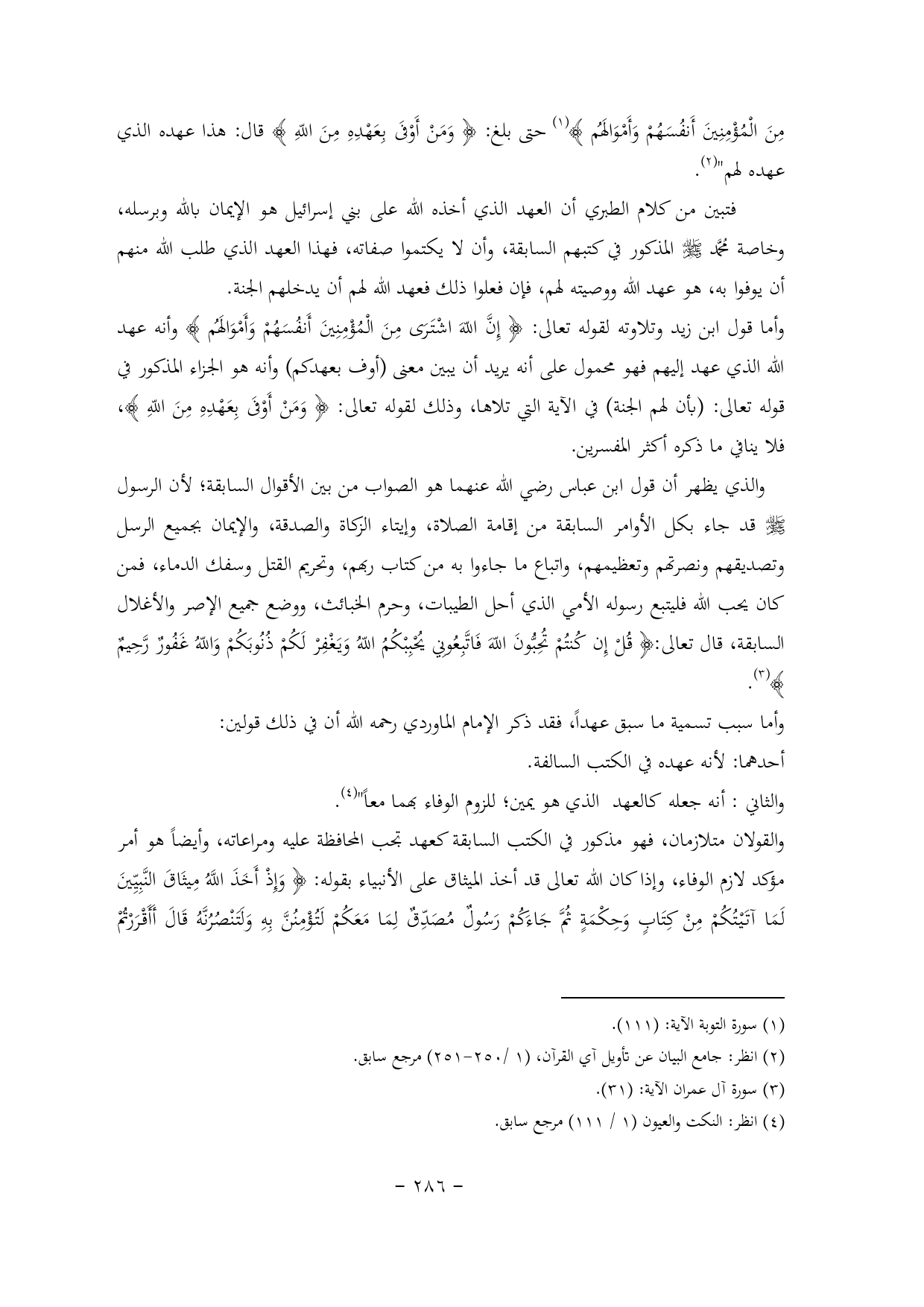 فتبين من كلام الطبري أن العهد الذي أخذه الله على بني إسرائيل هو الإيمان بالله وبرسله, وخاصة محمد - صلى الله عليه وسلم - المذكور في كتبهم السابقة, وأن لا يكتموا صفاته, فهذا العهد الذي طلب الله منهم أن يوفوا به, هو عهد الله ووصيته لهم, فإن فعلوا ذلك فعهد الله لهم أن يدخلهم الجنة.