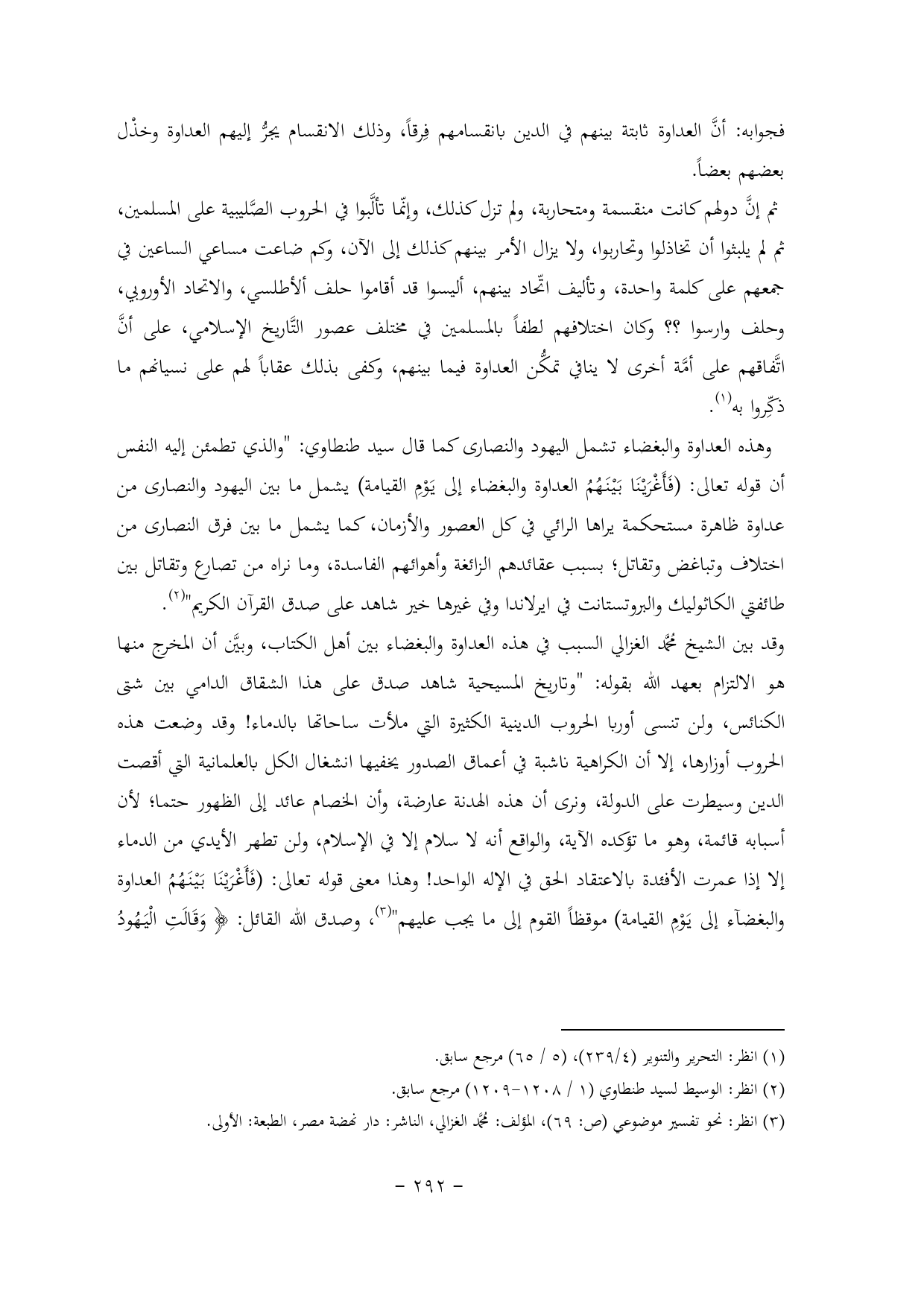 وقد بين الشيخ محمد الغزالي السبب في هذه العداوة والبغضاء بين أهل الكتاب, وبيَّن أن المخرج منها هو الالتزام بعهد الله بقوله: "وتاريخ المسيحية شاهد صدق على هذا الشقاق الدامي بين شتى الكنائس, ولن تنسى أوربا الحروب الدينية الكثيرة التي ملأت ساحاتها بالدماء! وقد وضعت هذه الحروب أوزارها، إلا أن الكراهية ناشبة في أعماق الصدور يخفيها انشغال الكل بالعلمانية التي أقصت الدين وسيطرت على الدولة, ونرى أن هذه الهدنة عارضة، وأن الخصام عائد إلى الظهور حتما؛ لأن أسبابه قائمة، وهو ما تؤكده الآية, والواقع أنه لا سلام إلا في الإسلام، ولن تطهر الأيدي من الدماء إلا إذا عمرت الأفئدة بالاعتقاد الحق في الإله الواحد! وهذا معنى قوله تعالى: (فَأَغْرَيْنَا بَيْنَهُمُ العداوة والبغضآء إلى يَوْمِ القيامة) موقظاً القوم إلى ما يجب عليهم" (¬3) , وصدق الله القائل: {وَقَالَتِ الْيَهُودُ