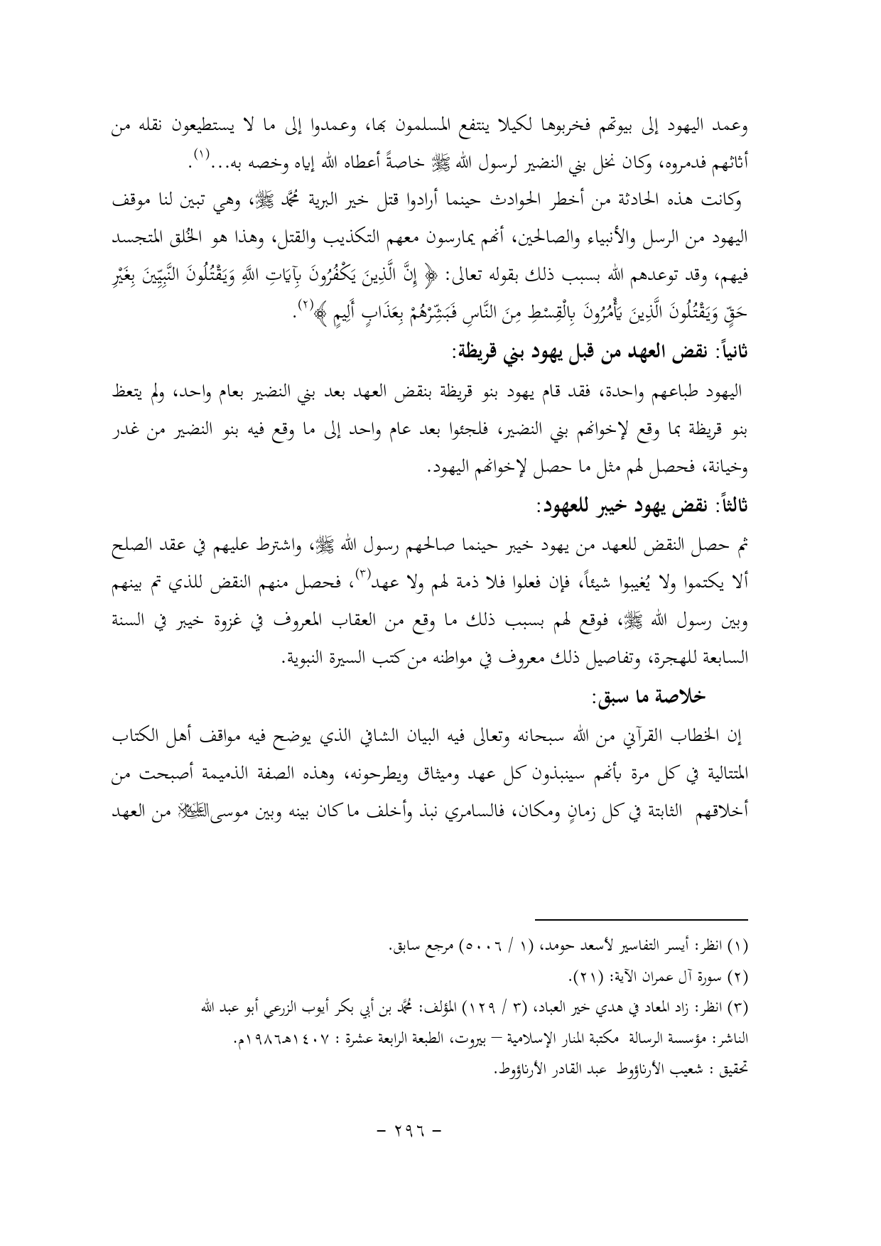 ثم حصل النقض للعهد من يهود خيبر حينما صالحهم رسول الله - صلى الله عليه وسلم - , واشترط عليهم في عقد الصلح ألا يكتموا ولا يُغيبوا شيئاً, فإن فعلوا فلا ذمة لهم ولا عهد (¬3) , فحصل منهم النقض للذي تم بينهم وبين رسول الله - صلى الله عليه وسلم - , فوقع لهم بسبب ذلك ما وقع من العقاب المعروف في غزوة خيبر في السنة السابعة للهجرة, وتفاصيل ذلك معروف في مواطنه من كتب السيرة النبوية.
