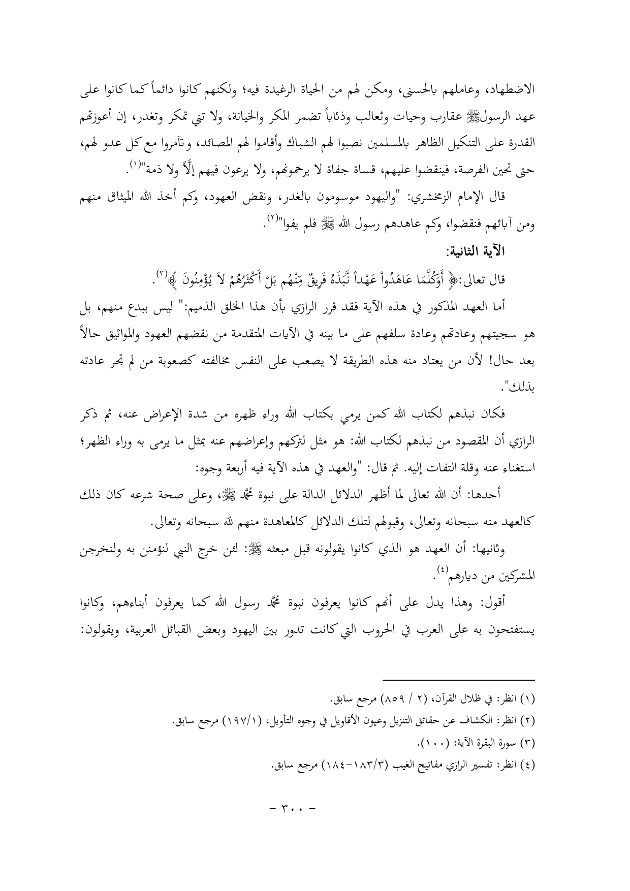 قال الإمام الزمخشري: "واليهود موسومون بالغدر, ونقض العهود, وكم أخذ الله الميثاق منهم ومن آبائهم فنقضوا, وكم عاهدهم رسول الله - صلى الله عليه وسلم - فلم يفوا" (¬2).