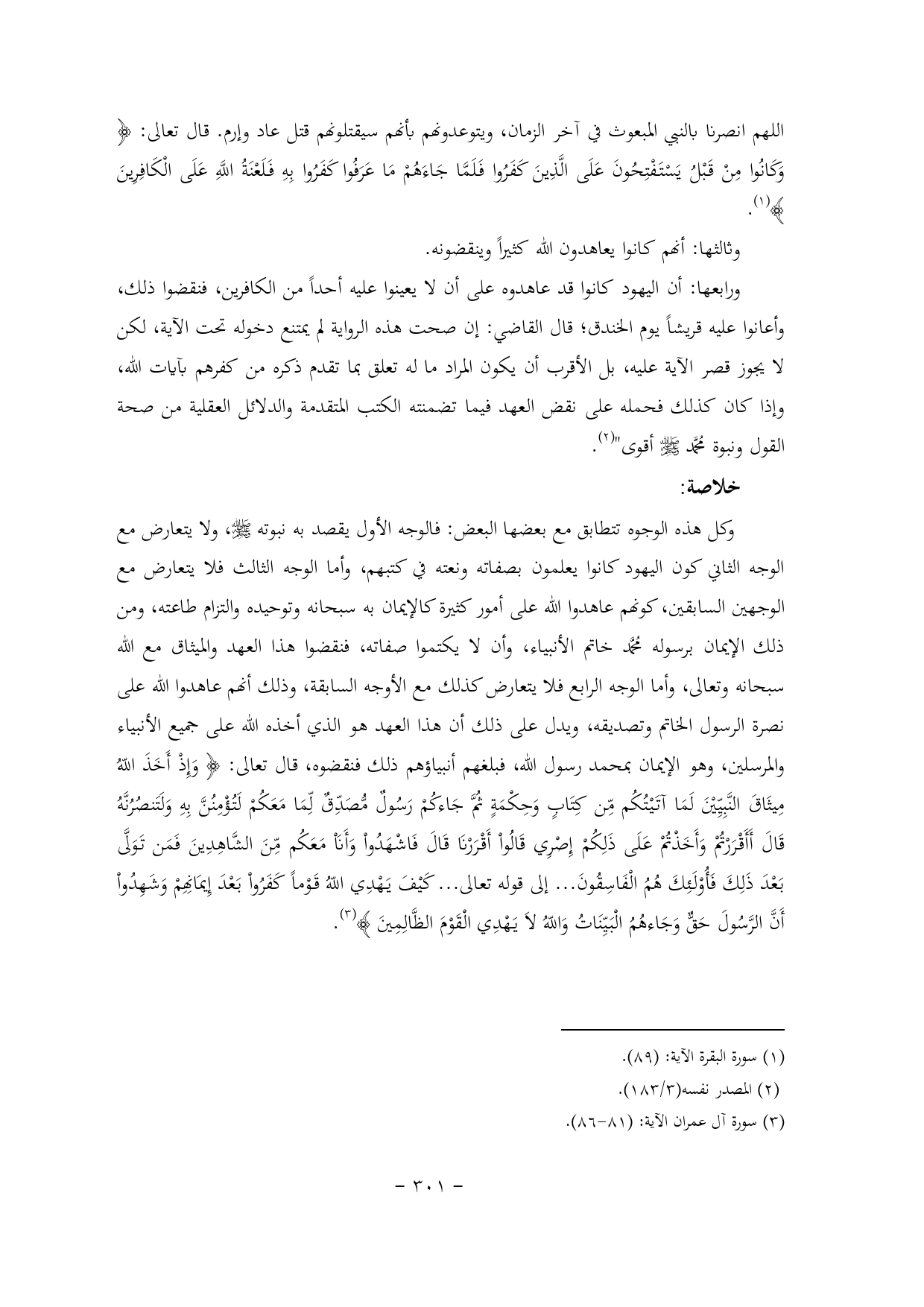 وكل هذه الوجوه تتطابق مع بعضها البعض: فالوجه الأول يقصد به نبوته - صلى الله عليه وسلم - , ولا يتعارض مع الوجه الثاني كون اليهود كانوا يعلمون بصفاته ونعته في كتبهم, وأما الوجه الثالث فلا يتعارض مع الوجهين السابقين, كونهم عاهدوا الله على أمور كثيرة كالإيمان به سبحانه وتوحيده والتزام طاعته, ومن ذلك الإيمان برسوله محمد خاتم الأنبياء، وأن لا يكتموا صفاته, فنقضوا هذا العهد والميثاق مع الله سبحانه وتعالى, وأما الوجه الرابع فلا يتعارض كذلك مع الأوجه السابقة, وذلك أنهم عاهدوا الله على نصرة الرسول الخاتم وتصديقه, ويدل على ذلك أن هذا العهد هو الذي أخذه الله على جميع الأنبياء والمرسلين، وهو الإيمان بمحمد رسول الله, فبلغهم أنبياؤهم ذلك فنقضوه, قال تعالى: {وَإِذْ أَخَذَ اللهُ مِيثَاقَ النَّبِيِّيْنَ لَمَا آتَيْتُكُم مِّن كِتَابٍ وَحِكْمَةٍ ثُمَّ جَاءكُمْ رَسُولٌ مُّصَدِّقٌ لِّمَا مَعَكُمْ لَتُؤْمِنُنَّ بِهِ وَلَتَنصُرُنَّهُ قَالَ أَأَقْرَرْتُمْ وَأَخَذْتُمْ عَلَى ذَلِكُمْ إِصْرِي قَالُوا أَقْرَرْنَا قَالَ فَاشْهَدُوا وَأَنَا مَعَكُم مِّنَ الشَّاهِدِينَ فَمَن تَوَلَّى بَعْدَ ذَلِكَ فَأُوْلَئِكَ هُمُ الْفَاسِقُونَ ... إلى قوله تعالى ... كَيْفَ يَهْدِي اللهُ قَوْماً كَفَرُوا بَعْدَ إِيمَانِهِمْ وَشَهِدُوا أَنَّ الرَّسُولَ حَقٌّ وَجَاءهُمُ الْبَيِّنَاتُ وَاللهُ لاَ يَهْدِي الْقَوْمَ الظَّالِمِينَ} (¬3).