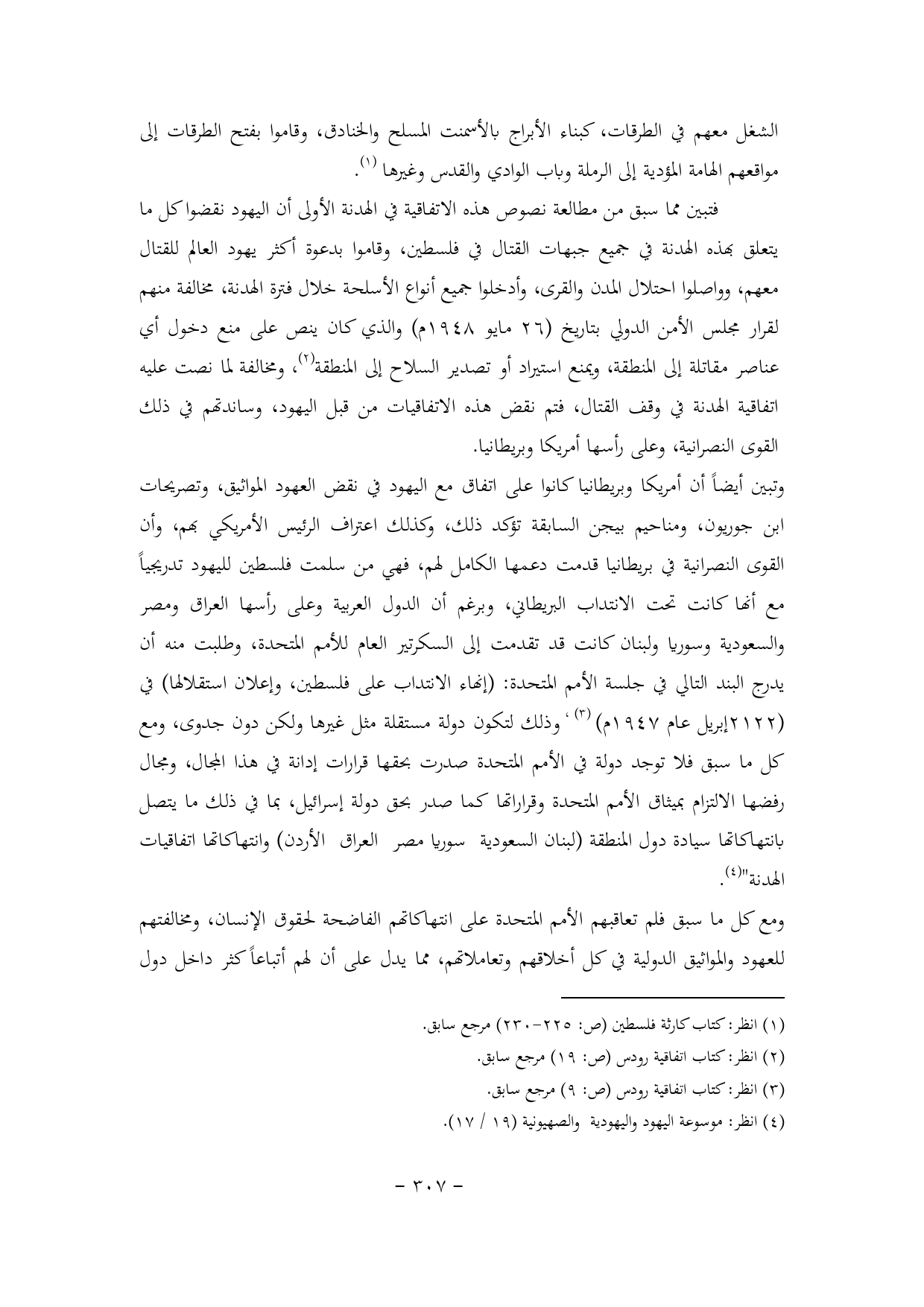 فتبين مما سبق من مطالعة نصوص هذه الاتفاقية في الهدنة الأولى أن اليهود نقضوا كل ما يتعلق بهذه الهدنة في جميع جبهات القتال في فلسطين, وقاموا بدعوة أكثر يهود العالم للقتال معهم, وواصلوا احتلال المدن والقرى, وأدخلوا جميع أنواع الأسلحة خلال فترة الهدنة, مخالفة منهم لقرار مجلس الأمن الدولي بتاريخ (26 مايو 1948 م) والذي كان ينص على منع دخول أي عناصر مقاتلة إلى المنطقة, ويمنع استيراد أو تصدير السلاح إلى المنطقة (¬2) , ومخالفة لما نصت عليه اتفاقية الهدنة في وقف القتال, فتم نقض هذه الاتفاقيات من قبل اليهود, وساندتهم في ذلك القوى النصرانية, وعلى رأسها أمريكا وبريطانيا.