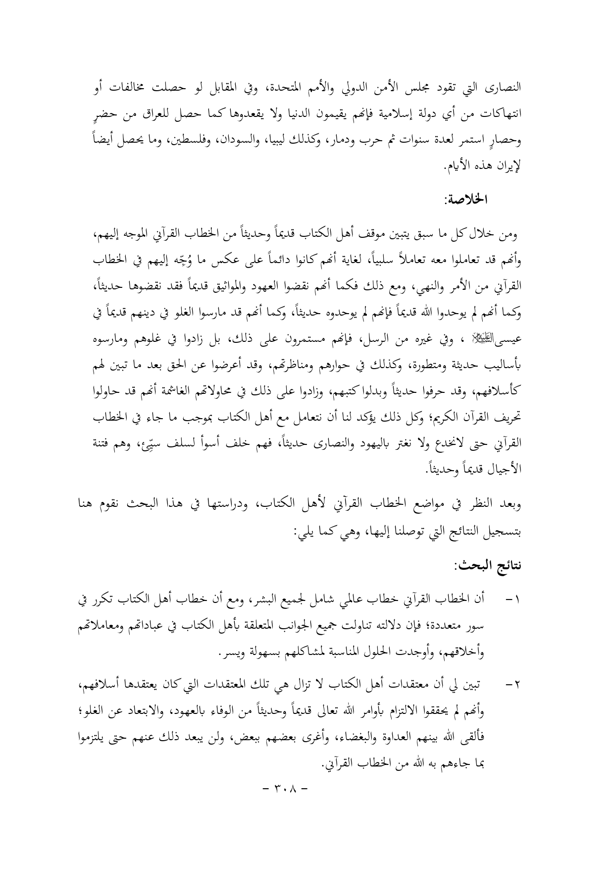 وبعد النظر في مواضع الخطاب القرآني لأهل الكتاب, ودراستها في هذا البحث نقوم هنا بتسجيل النتائج التي توصلنا إليها, وهي كما يلي: