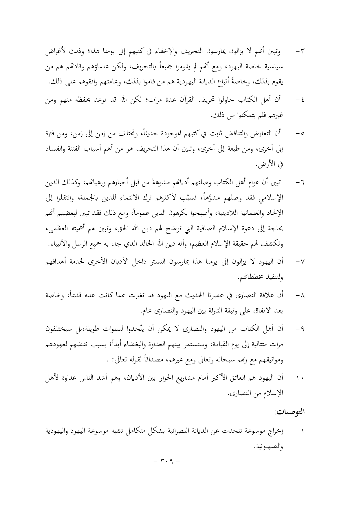 10 - أن اليهود هم العائق الأكبر أمام مشاريع الحوار بين الأديان, وهم أشد الناس عداوة لأهل الإسلام من النصارى.