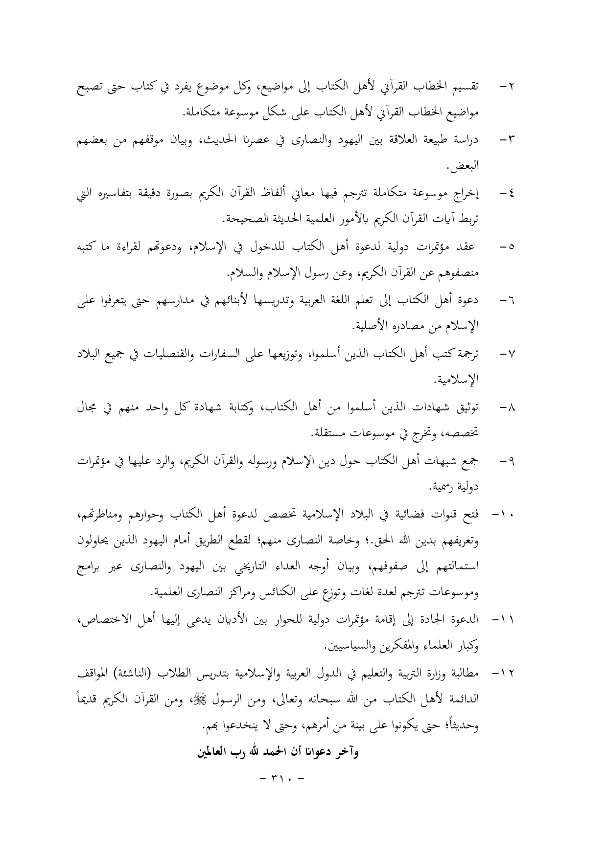 6 - دعوة أهل الكتاب إلى تعلم اللغة العربية وتدريسها لأبنائهم في مدارسهم حتى يتعرفوا على الإسلام من مصادره الأصلية.