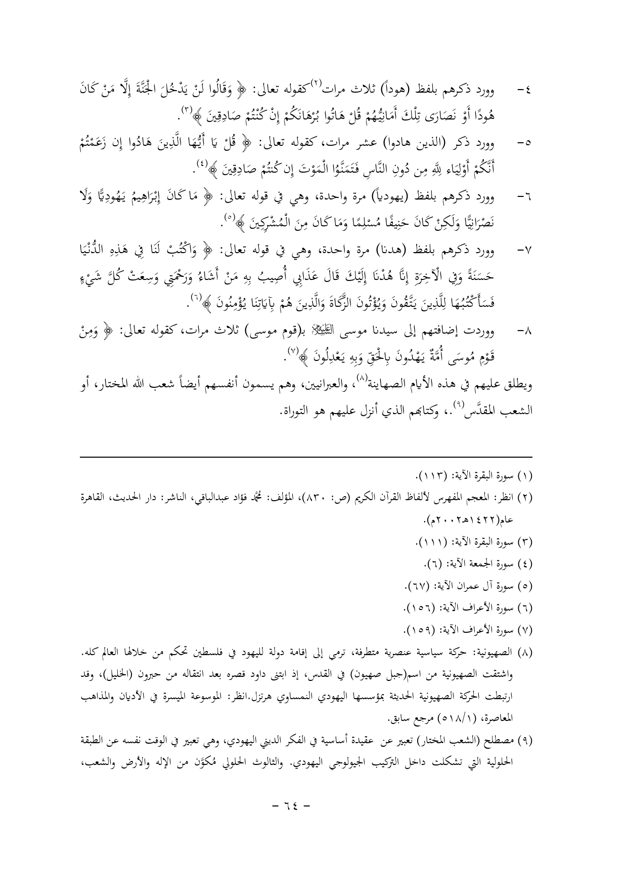 5 - وورد ذكر (الذين هادوا) عشر مرات, كقوله تعالى: {قُلْ يَا أَيُّهَا الَّذِينَ هَادُوا إِن زَعَمْتُمْ أَنَّكُمْ أَوْلِيَاء لِلَّهِ مِن دُونِ النَّاسِ فَتَمَنَّوُا الْمَوْتَ إِن كُنتُمْ صَادِقِينَ} (¬3).