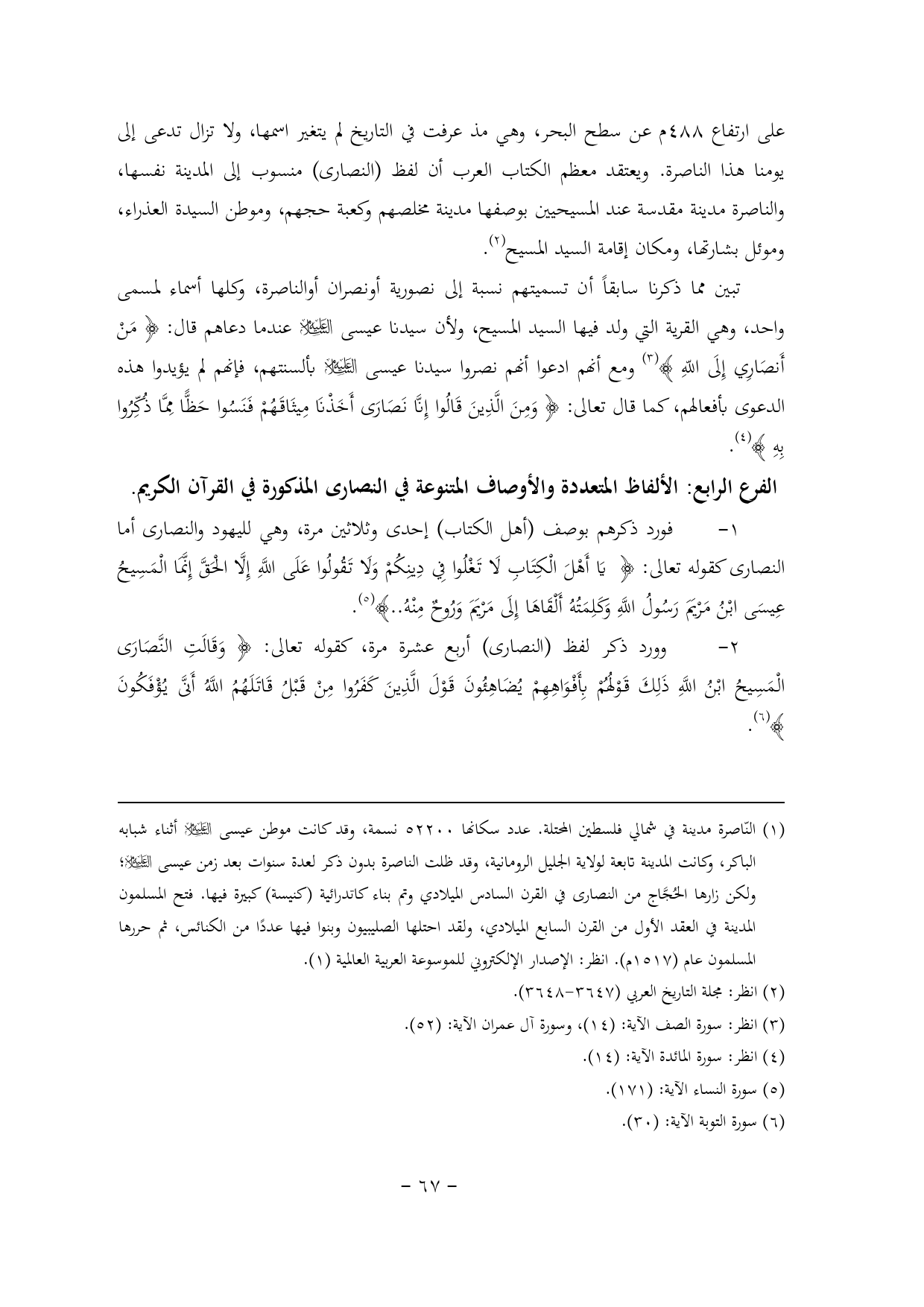 2 - وورد ذكر لفظ (النصارى) أربع عشرة مرة, كقوله تعالى: {وَقَالَتِ النَّصَارَى الْمَسِيحُ ابْنُ اللَّهِ ذَلِكَ قَوْلُهُمْ بِأَفْوَاهِهِمْ يُضَاهِئُونَ قَوْلَ الَّذِينَ كَفَرُوا مِنْ قَبْلُ قَاتَلَهُمُ اللَّهُ أَنَّى يُؤْفَكُونَ} (¬5).