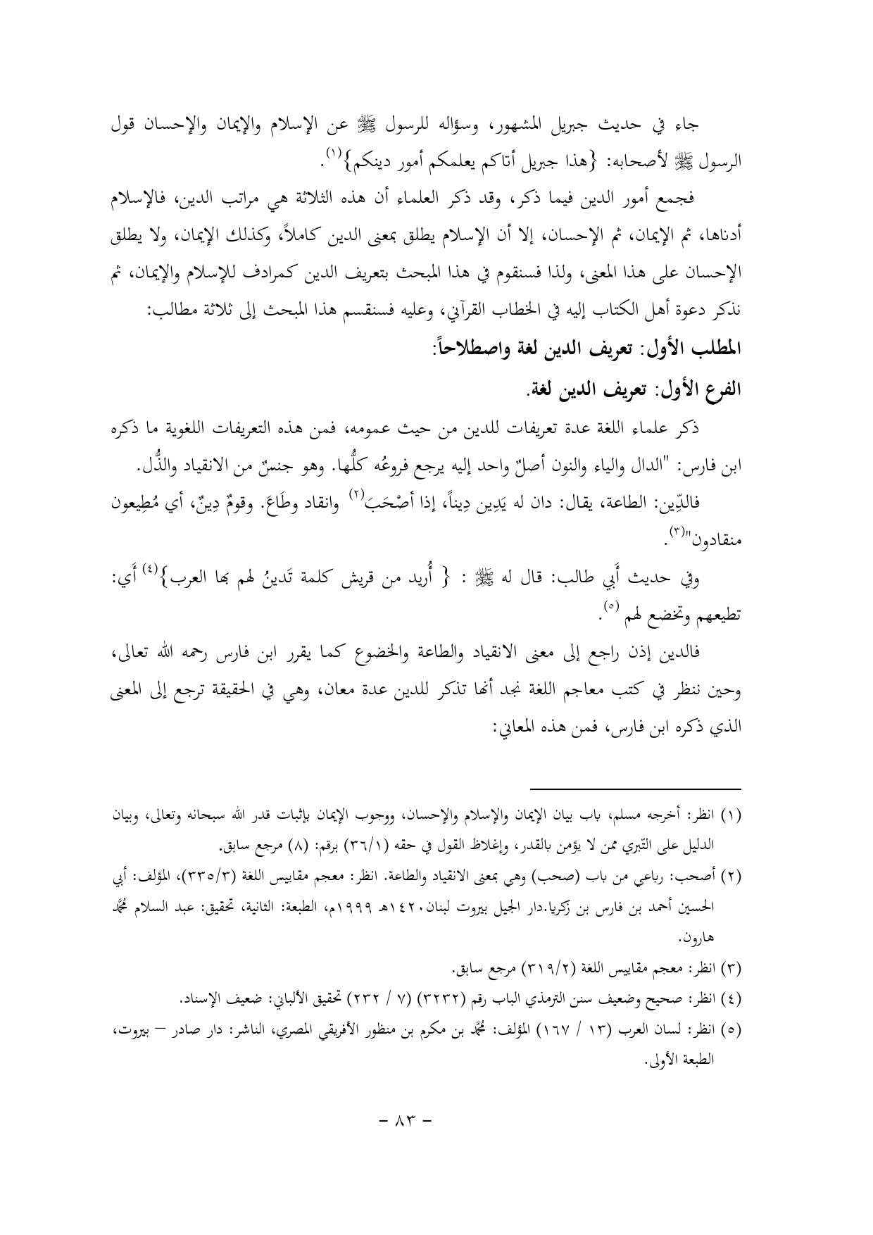 فجمع أمور الدين فيما ذكر, وقد ذكر العلماء أن هذه الثلاثة هي مراتب الدين, فالإسلام أدناها, ثم الإيمان, ثم الإحسان, إلا أن الإسلام يطلق بمعنى الدين كاملاً, وكذلك الإيمان, ولا يطلق الإحسان على هذا المعنى, ولذا فسنقوم في هذا المبحث بتعريف الدين كمرادف للإسلام والإيمان, ثم نذكر دعوة أهل الكتاب إليه في الخطاب القرآني, وعليه فسنقسم هذا المبحث إلى ثلاثة مطالب: