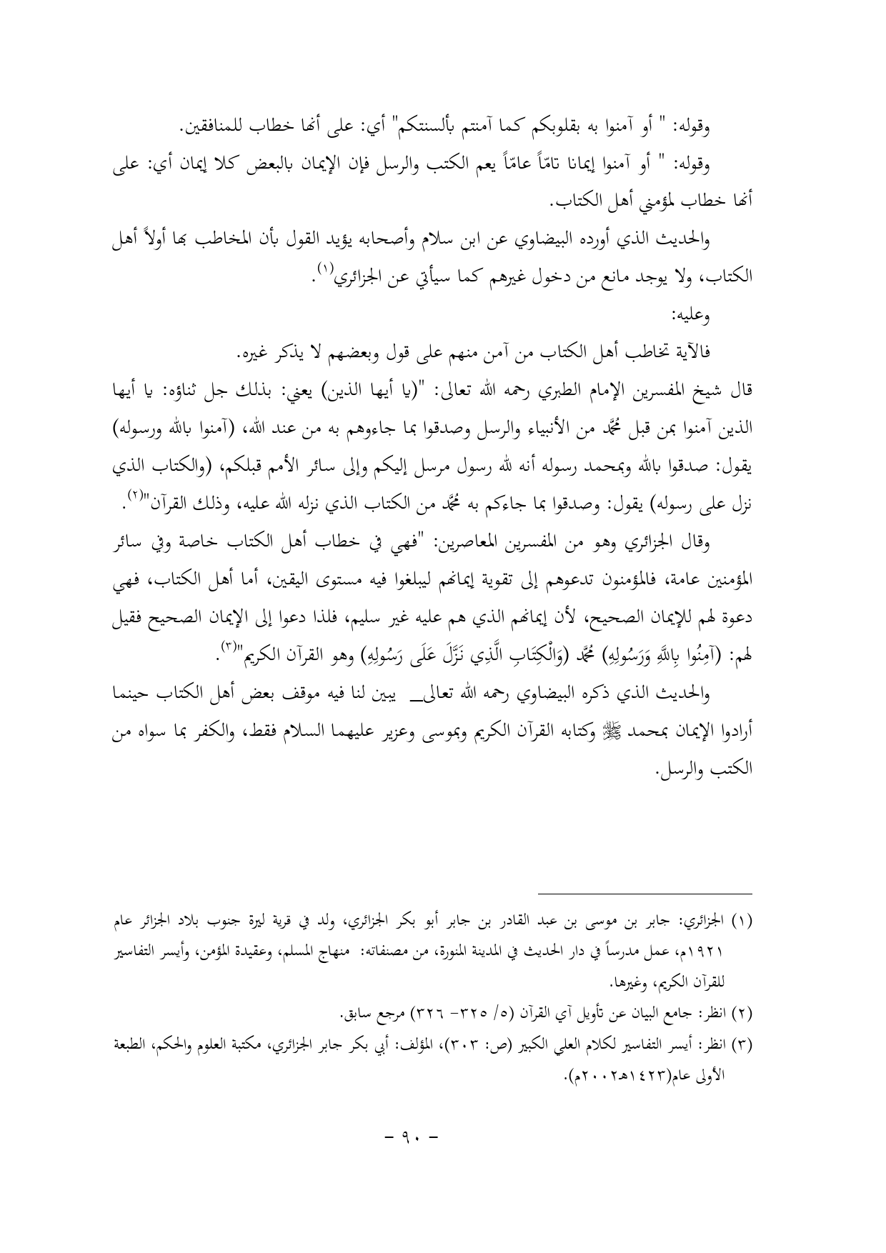 (¬1) الجزائري: جابر بن موسى بن عبد القادر بن جابر أبو بكر الجزائري، ولد في قرية ليرة جنوب بلاد الجزائر عام 1921 م، عمل مدرساً في دار الحديث في المدينة المنورة، من مصنفاته: منهاج المسلم, وعقيدة المؤمن, وأيسر التفاسير للقرآن الكريم, وغيرها.
