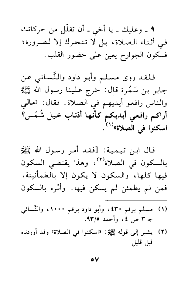 فلقد روى مسلم وأبو داود والنسائي عن جابر بن سَمُرة قال: خرج علينا رسول الله -صلى الله عليه وسلم- والناس رافعوا أيديهم في الصلاة. فقال: «ما لي أراكم رافعي أيديكم كأنها أذناب خيل شُمْس؟ اسكنوا في الصلاة» (¬1).