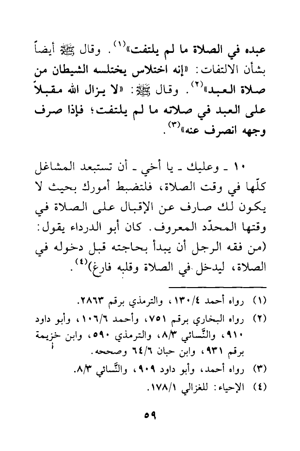 10 - وعليك -يا أخي- أن تستبعد المشاغل كلّها في وقت الصلاة، فلتضبط أمورك بحيث لا يكون لك صارف عن الإقبال على الصلاة في وقتها المحدّد المعروف. كان أبو الدرداء يقول: (من فقه الرجل أن يبدأ بحاجته قبل دخوله في الصلاة، ليدخل في الصلاة وقلبه فارغ) (¬4).