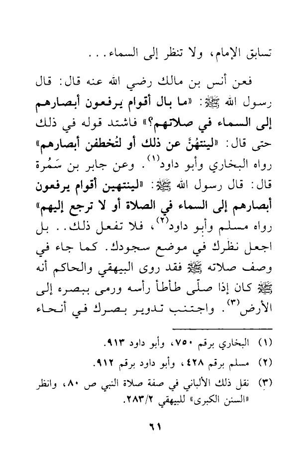 فعن أنس بن مالك -رضي الله عنه- قال: قال رسول الله -صلى الله عليه وسلم-: «ما بال أقوام يرفعون أبصارهم إلى السماء في صلاتهم؟» فاشتد قوله في ذلك حتى قال: «لينتهُنَّ عن ذلك أو لتُخطفن أبصارهم» رواه البخاري وأبو داود (¬1). وعن جابر بن سَمُرة قال: قال رسول الله -صلى الله عليه وسلم-: «لينتهين أقوام يرفعون أبصارهم إلى السماء في الصلاة أو لا ترجع إليهم» رواه مسلم وأبو داود (¬2)، فلا تفعل ذلك .. بل اجعل نظرك في موضع سجودك، كما جاء في وصف صلاته -صلى الله عليه وسلم- فقد روى البيهقي والحاكم أنه -صلى الله عليه وسلم- كان إذا صلّى طأطأ رأسه ورمى ببصره إلى الأرض (¬3). واجتنب تدوير بصرك في أنحاء