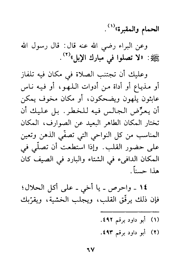وعن البراء -رضي الله عنه- قال: قال رسول الله -صلى الله عليه وسلم-: «لَا تُصَلُّوا فِي مَبَارِكِ الْإِبِلِ» (¬2).