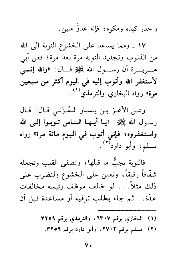 17 - ومما يساعد على الخشوع التوبة إلى الله من الذنوب وتجديد التوبة مرة بعد مرة؛ فعن أبي هريرة أن رسول الله -صلى الله عليه وسلم- قال: «وَاللَّهِ إِنِّي لَأَسْتَغْفِرُ اللَّهَ وَأَتُوبُ إِلَيْهِ فِي اليَوْمِ أَكْثَرَ مِنْ سَبْعِينَ مَرَّةً» رواه البخاري والترمذي (¬1).