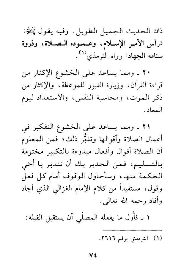 ذاك الحديث الجميل الطويل. وفيه يقول -صلى الله عليه وسلم-: «رَأْسُ الأَمْرِ الإِسْلَامُ، وَعَمُودُهُ الصَّلَاةُ، وَذِرْوَةُ سَنَامِهِ الجِهَادُ» رواه الترمذي (¬1).