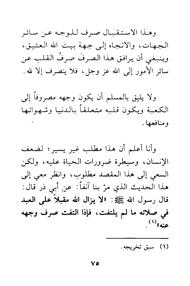 وأنا أعلم أن هذا مطلب غير يسير؛ لضعف الإنسان، وسيطرة ضرورات الحياة عليه، ولكن السعي إلى هذا المقصد مطلوب، وانظر معي إلى هذا الحديث الذي مرّ بنا آنفاً: عن أبي ذر قال: قال رسول الله -صلى الله عليه وسلم-: «لَا يَزَالُ اللَّهُ مُقْبِلًا عَلَى الْعَبْدِ فِي صَلَاتِهِ، مَا لَمْ يَلْتَفِتْ، فَإِذَا صَرَفَ وَجْهَهُ انْصَرَفَ عَنْهُ» (¬1).